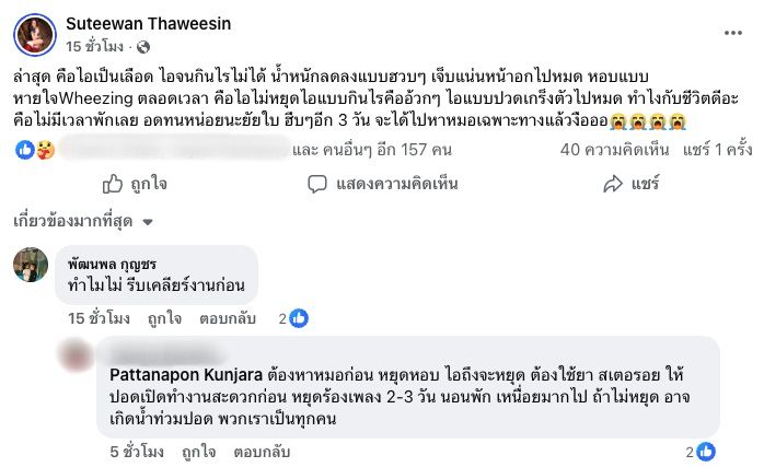 โดยในเฟซบุ๊ก Suteewan Thaweesin ใบเตยโพสต์เล่าถึงอาการป่วยของตัวเองไว้ว่า “ล่าสุด คือไอเป็นเลือด ไอจนกินไรไม่ได้ น้ำหนักลดลงแบบฮวบๆ เจ็บแน่นหน้าอกไปหมด หอบแบบหายใจ Wheezing ตลอดเวลา คือไอไม่หยุด ไอแบบกินไรคืออ้วกๆ ไอแบบปวดเกร็งตัวไปหมด ทำไงกับชีวิตดีอะ คือไม่มีเวลาพักเลย อดทนหน่อยนะยัยใบ ฮึบๆ อีก 3 วัน จะได้ไปหาหมอเฉพาะทางแล้วงือออ”