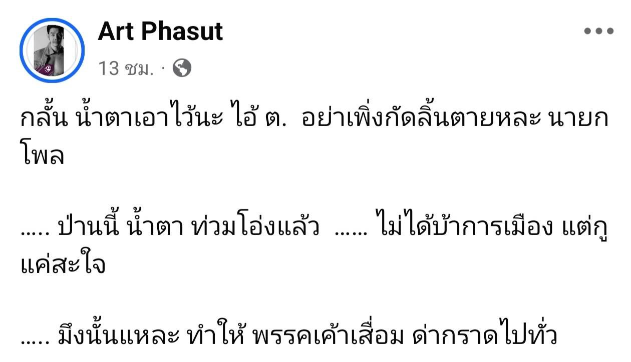 โดยในเฟซบุ๊ก Art Phasut ได้โพสต์ภาพรวมผลคะแนนเลือกตั้ง พร้อมทั้งเขียนข้อความว่า “กลั้นน้ำตาเอาไว้นะ ไอ้ ต. อย่าเพิ่งกัดลิ้นตายล่ะ นายกโพล ….. ป่านนี้น้ำตาท่วมโอ่งแล้ว …… ไม่ได้บ้าการเมือง แต่กูแค่สะใจ ….. มึงนั้นแหละทำให้ พรรคเค้าเสื่อม ด่ากราดไปทั่ว”