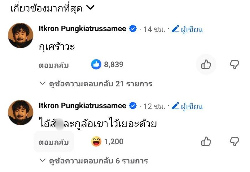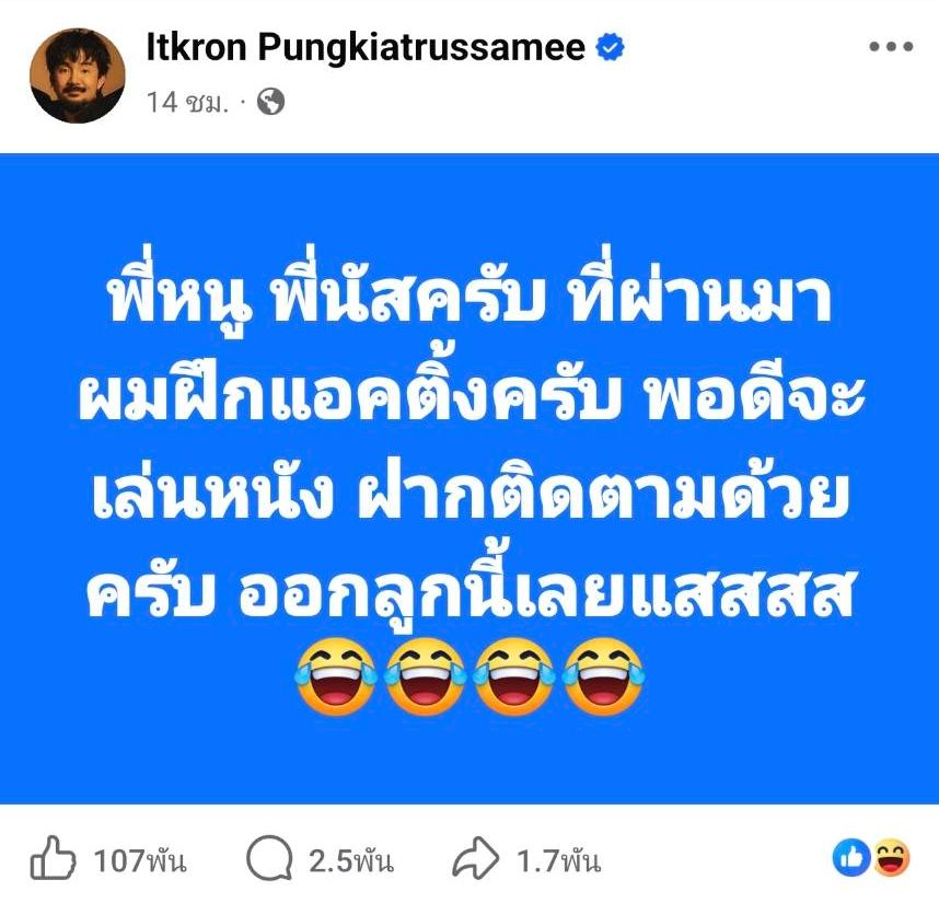 ก่อนจะโพสต์สเตตัสเพิ่มเติมอีกว่า “พี่หนู พี่นัสครับ ที่ผ่านมาผมฝึกแอ็กติ้งครับ พอดีจะเล่นหนัง ฝากติดตามด้วยครับ ออกลูกนี้เลยแสสสส” และใส่อีโมจิขำน้ำตาไหล ก่อนจะคอมเมนต์เพิ่มเติมว่า “กุเศร้าวะ” และ “ไอ้สัxละกูล้อเขาไว้เยอะด้วย”