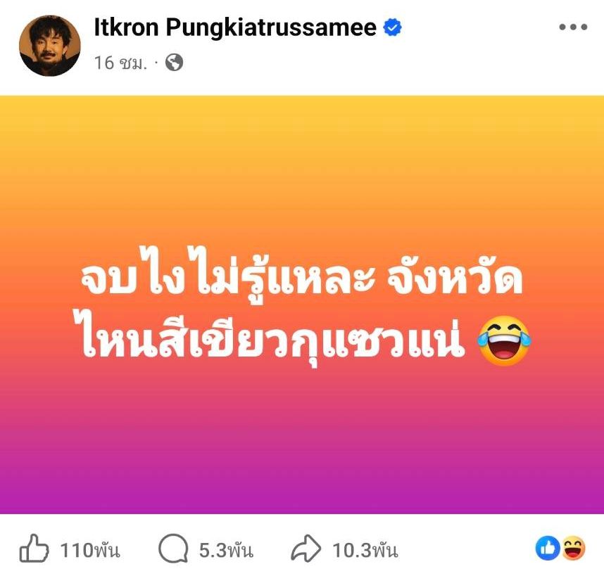 แต่หลังจากนั้น ไผ่ ลิกค์ ว่าที่ ส.ส.พรรคกล้าธรรม เขต 1 จ.กำแพงเพชร ก็โพสต์ข้อความถาม จ๋าย ไททศมิตร แบบตรงๆ โดยบอกว่า “จังหวัดไหนเป็นเขียวมันเป็นไงครับ Itkron Pungkiatrussamee ไม่ดีจะได้ปรับปรุงครับ”