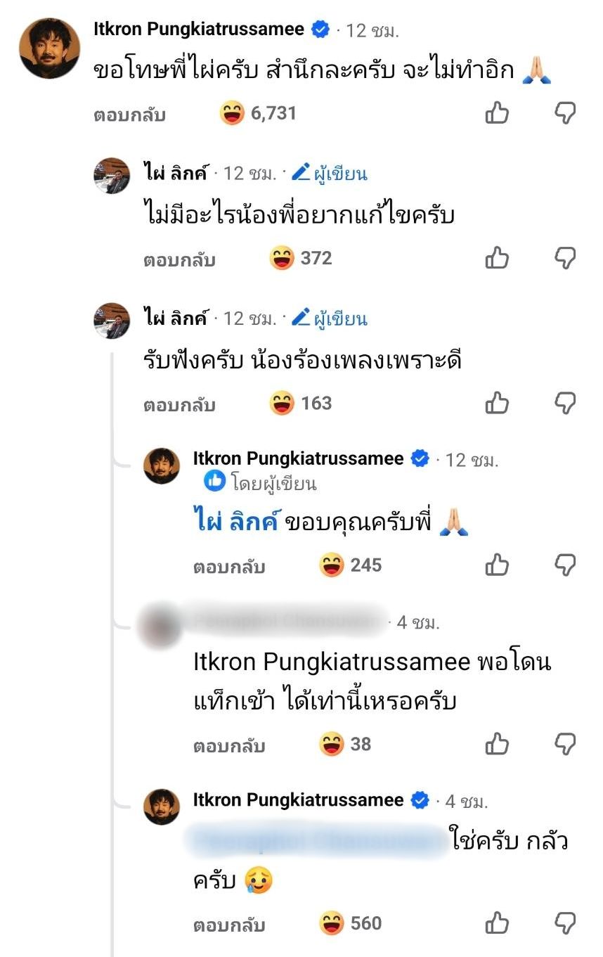 งานนี้จ๋ายเลยเข้ามาคอมเมนต์ตอบกลับว่า “ขอโทษพี่ไผ่ครับ สำนึกละครับ จะไม่ทำอิก” จากนั้นไผ่ก็คอมเมนต์ตอบกลับจ๋ายอีก อาทิ “ไม่มีอะไรน้องพี่อยากแก้ไขครับ” และ “รับฟังครับ น้องร้องเพลงเพราะดี” และจ๋ายก็ตอบกลับว่า “ขอบคุณครับพี่”