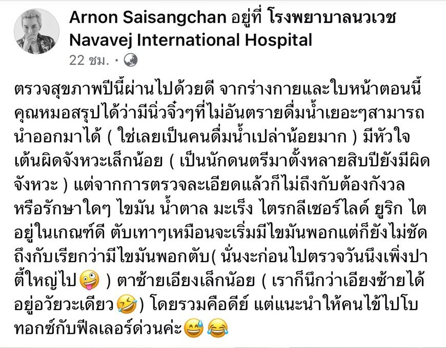 “ตรวจสุขภาพปีนี้ผ่านไปด้วยดี จากร่างกายและใบหน้าตอนนี้ คุณหมอสรุปได้ว่ามีนิ่วจิ๋ว ๆ ที่ไม่อันตราย ดื่มน้ำเยอะ ๆ สามารถนำออกมาได้ (ใช่เลย เป็นคนดื่มน้ำเปล่าน้อยมาก) มีหัวใจเต้นผิดจังหวะเล็กน้อย (เป็นนักดนตรีมาตั้งหลายสิบปี ยังมีผิดจังหวะ) แต่จากการตรวจละเอียดแล้วก็ไม่ถึงกับต้องกังวลหรือรักษาใด ๆ ไขมัน น้ำตาล มะเร็ง ไตรกลีเซอไรด์ ยูริก ไต อยู่ในเกณฑ์ดี ตับเทา ๆ เหมือนจะเริ่มมีไขมันพอก แต่ก็ยังไม่ชัดถึงกับเรียกว่ามีไขมันพอกตับ (นั่นไง ก่อนไปตรวจวันหนึ่ง เพิ่งปาร์ตี้ใหญ่ไป) ตาซ้ายเอียงเล็กน้อย (เราก็นึกว่าเอียงซ้ายได้อยู่ อวัยวะเดียว) โดยรวมคือดี แต่แนะนำให้คนไข้ไปโบท็อกซ์กับฟิลเลอร์ด่วนค่ะ”