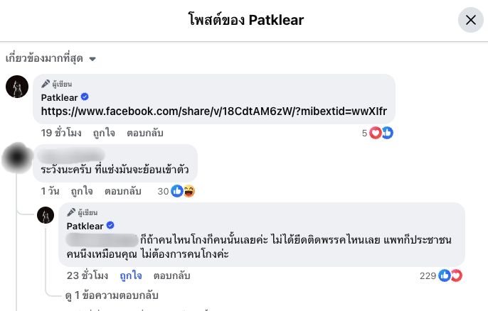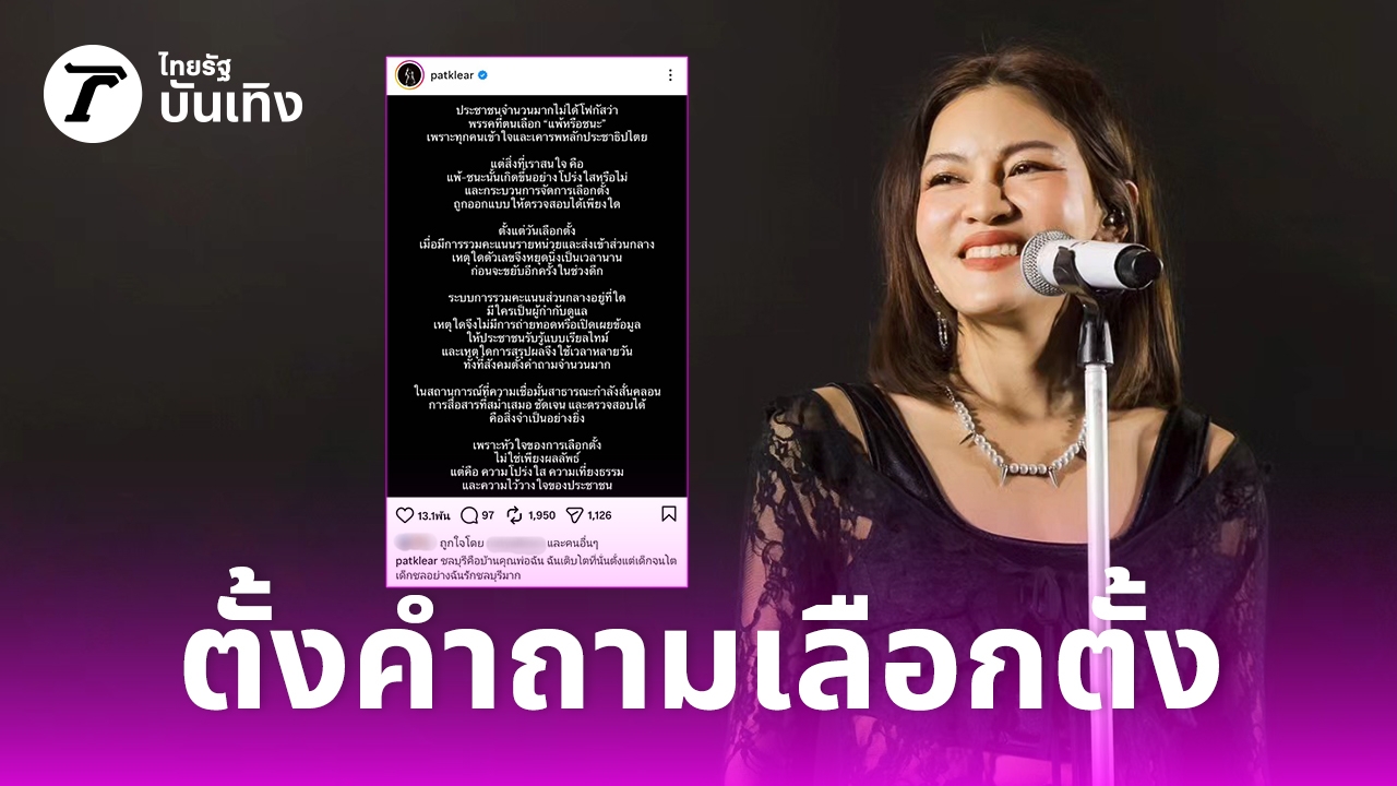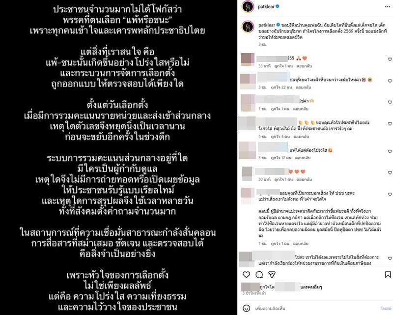 ซึ่ง แพท KLEAR ก็ได้เขียนแคปชั่นในโพสต์นี้ไว้ว่า “ชลบุรีคือบ้านคุณพ่อฉัน ฉันเติบโตที่นั่นตั้งแต่เด็กจนโต เด็กชลอย่างฉันรักชลบุรีมาก ถ้าใครโกงการเลือกตั้ง 2569 ครั้งนี้ ขอแช่งอีกทีว่าขอให้ล่มจมตลอดชีวิต”