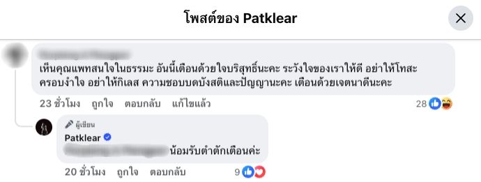 ซึ่งแพทก็ตอบกลับว่า “น้อมรับคำตักเตือนค่ะ” ก่อนจะเปลี่ยนแคปชั่นในโพสต์ว่า “ชลบุรีคือบ้านคุณพ่อฉัน ฉันเติบโตที่นั่นตั้งแต่เด็กจนโต เด็กชลอย่างฉันรักชลบุรีมาก”