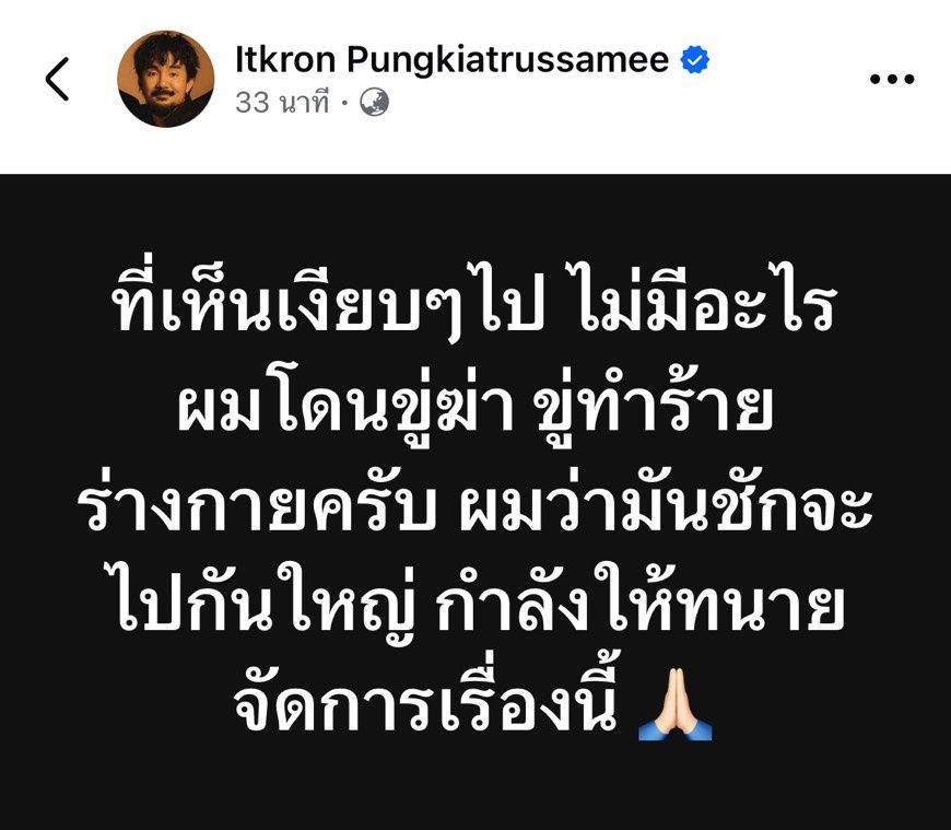 "ที่เห็นเงียบๆ ไป ไม่มีอะไร ผมโดนขู่ฆ่า ขู่ทำร้ายร่างกายครับ ผมว่ามันชักจะไปกันใหญ่ กำลังให้ทนายจัดการเรื่องนี้"
