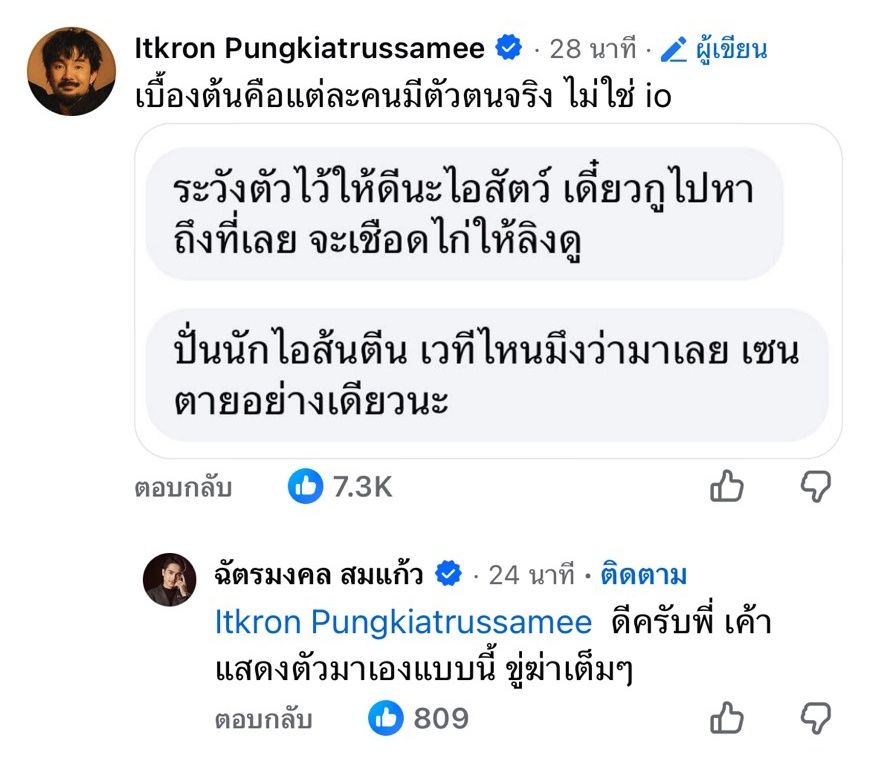 จากนั้นก็ได้เขียนเพิ่มเติมในคอมเมนต์ว่า "เบื้องต้นคือแต่ละคนมีตัวตนจริง ไม่ใช่ io" และเปิดข้อความแชตที่ถูกขู่ หลายคนที่ติดตามก็ได้เข้ามาคอมเมนต์กันจำนวนมาก รวมถึง ยิว ฉัตรมงคล บอกว่า "ดีครับพี่ เค้าแสดงตัวมาเองแบบนี้ ขู่ฆ่าเต็มๆ"