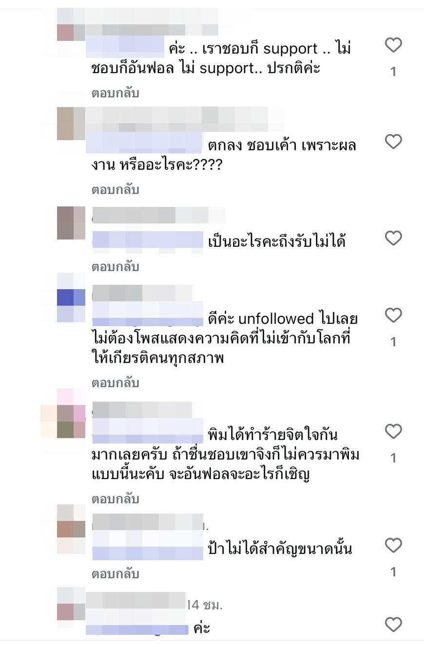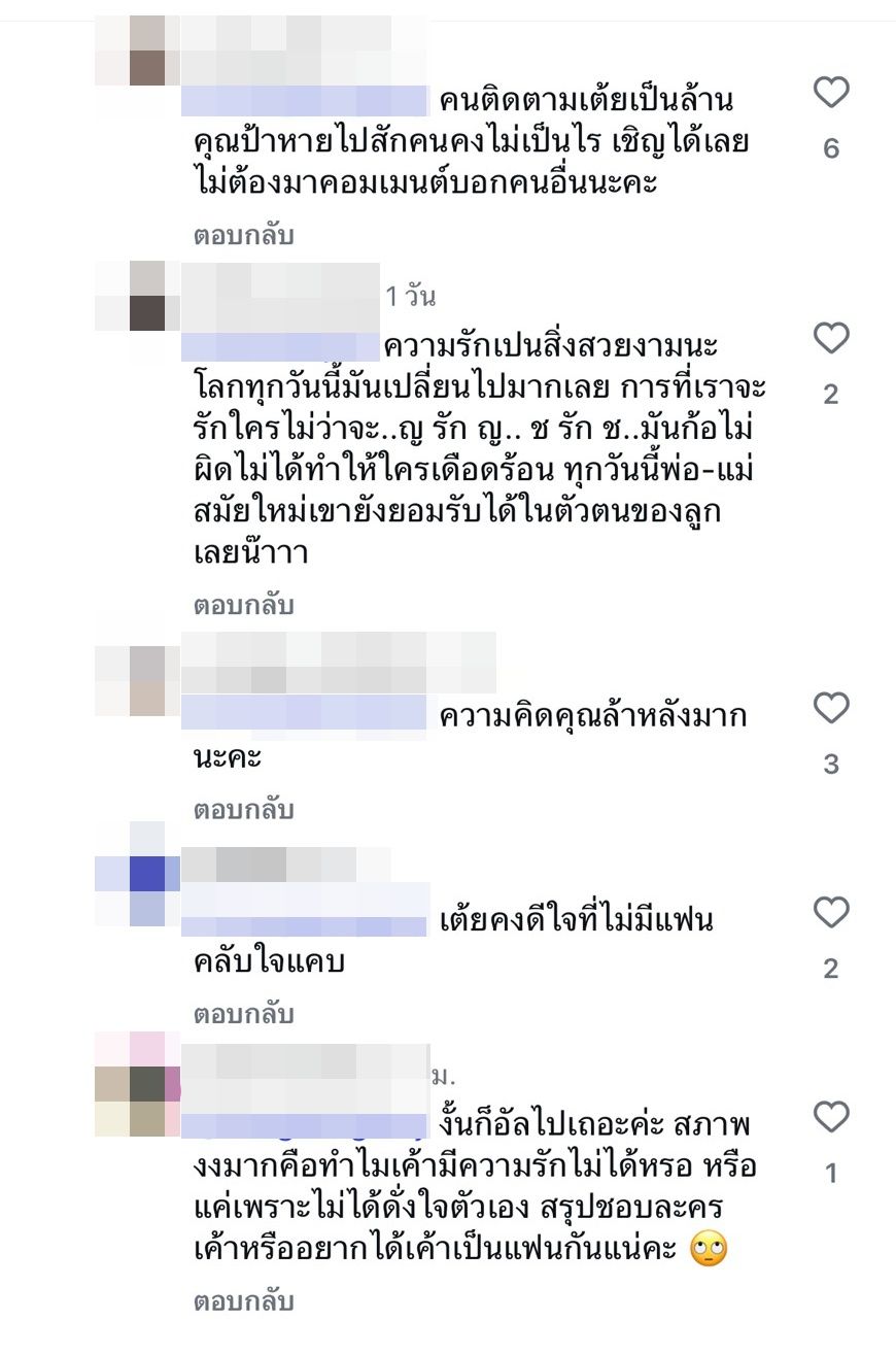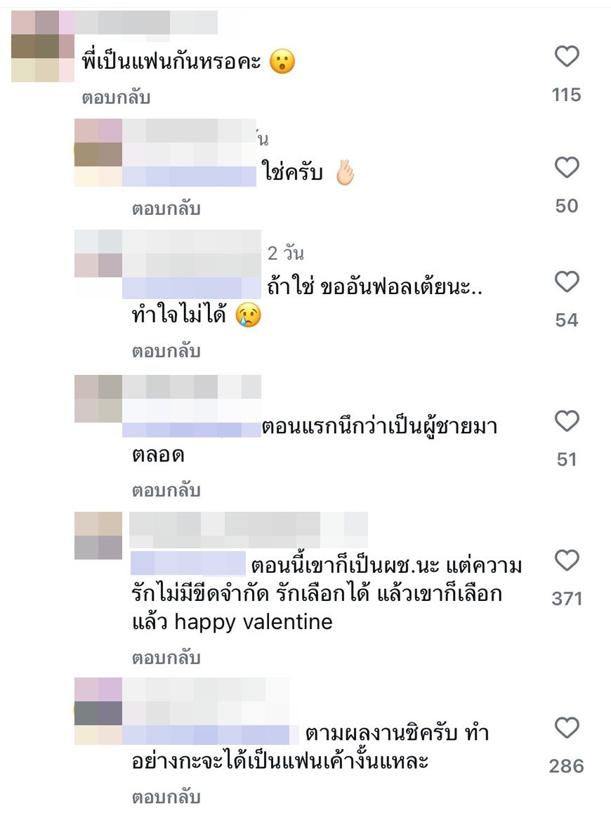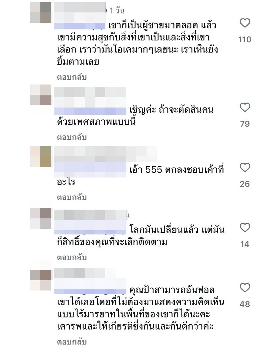 งานนี้เลยทำให้แฟนคลับต่างเข้ามาคอมเมนต์ปกป้องทันที บอกว่า เขาก็เป็นผู้ชายมาตลอด ความรักเป็นสิ่งสวยงามและไม่มีเงื่อนไข อาทิ ตอนนี้เขาก็เป็นผช.นะ แต่ความรักไม่มีขีดจำกัด รักเลือกได้ แล้วเขาก็เลือกแล้ว happy valentine, ตามผลงานซิครับ ทำอย่างกะจะได้เป็นแฟนเค้างั้นแหละ, เขาก็เป็นผู้ชายมาตลอด แล้วเขามีความสุขกับสิ่งที่เขาเป็นและสิ่งที่เขาเลือก เราว่ามันโอเคมากๆเลยนะ เราเห็นยังยิ้มตามเลย, เชิญค่ะ ถ้าจะตัดสินคนด้วยเพศสภาพแบบนี้, โลกมันเปลี่ยนแล้ว แต่มันก็สิทธิ์ของคุณที่จะเลิกติดตาม, คุณป้าสามารถอันฟอลเขาได้เลยโดยที่ไม่ต้องมาแสดงความคิดเห็นแบบไร้มารยาทในพื้นที่ของเขาก็ได้นะคะ เคารพและให้เกียรติซึ่งกันและกันดีกว่าค่ะ เป็นต้น