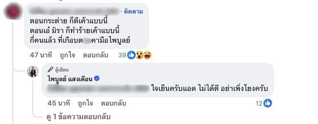 จากนั้นก็มีแฟนๆ คอมเมนต์ให้กำลังใจ ในขณะที่มีเพจหนึ่งคอมเมนต์วิจารณ์ครูไพบูลย์อย่างดุเดือดว่า “ตอนกระต่าย ก็ตีเค้าแบบนี้ ตอนเอ๋ มิรา ก็ทำร้ายเค้าแบบนี้ กี่คนแล้ว ที่เกือบตxxคามือไพบูลย์” ซึ่งครูไพบูลย์ก็ตอบกลับว่า “ใจเย็นครับแอด ไม่ได้ตี อย่าเพิ่งโยงครับ”