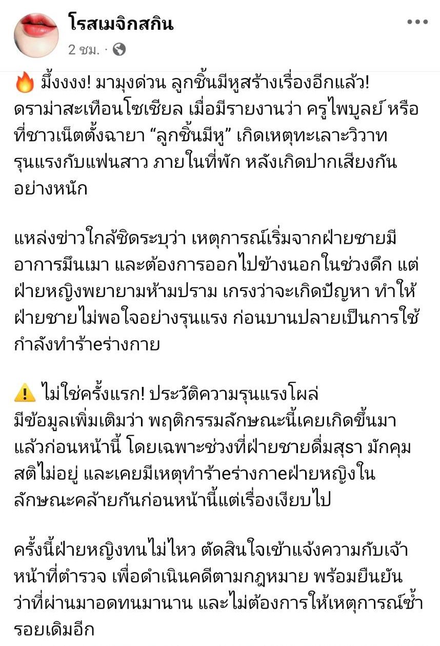 แถมยังบอกว่าไม่ใช่ครั้งแรก พฤติกรรมลักษณะนี้เคยเกิดขึ้นมาแล้วก่อนหน้านี้ โดยเฉพาะช่วงที่ฝ่ายชายดื่มสุรา มักคุมสติไม่อยู่ และเคยมีเหตุทำร้ายร่างกายฝ่ายหญิงในลักษณะคล้ายกันก่อนหน้านี้แต่เรื่องเงียบไป ก่อนจะเผยภาพใบแจ้งความของฝ่ายหญิง รวมถึงคลิปวิดีโอที่ได้ยินเสียงเหมือนครูไพบูลย์และแฟนสาวทะเลาะกันอย่างหนักในคอมเมนต์ใต้โพสต์ด้วย