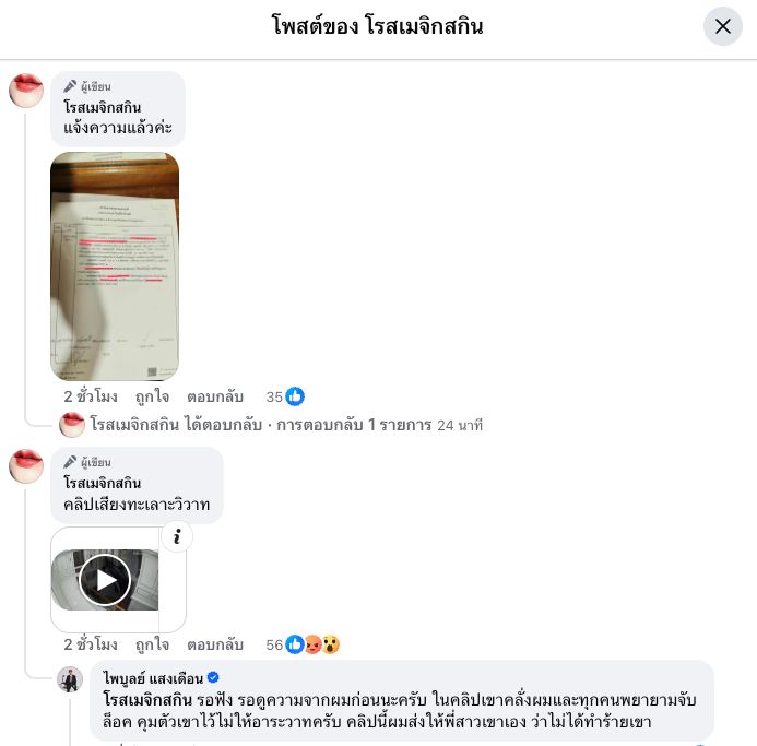 โดยหลังจากที่ครูไพบูลย์ชี้แจงแล้ว เพจโรสเมจิกสกินก็คอมเมนต์เผยถึงฝ่ายหญิงว่า “สงสัยได้แxกอาหารหมาแล้วค่ะท่านผู้ชม 5555555555 ผญ ทักมาให้ลบ กูสมน้ำหน้าดีมั้ย บรู้ววววววววววว” และ “ไม่แxกหรอก ผญ ตกใจกับคอมเมนต์เขามาอ่านและรู้สึกไม่ดี เลยอยากให้ลบ แต่ตำรวจออกหมายเรียกเรียบร้อยแล้ว เรื่องเข้าสู่กระบวนการแล้ว”