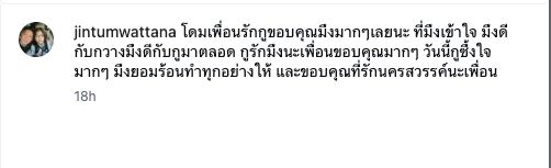 "โดมเพื่อนรักกูขอบคุณมึงมากๆ เลยนะ ที่มึงเข้าใจ มึงดีกับกวาง มึงดีกับกูมาตลอด กูรักมึงนะเพื่อน ขอบคุณมากๆ วันนี้กูซึ้งใจมากๆ มึงยอมร้อนทำทุกอย่างให้ และขอบคุณที่รักนครสวรรค์นะเพื่อน"