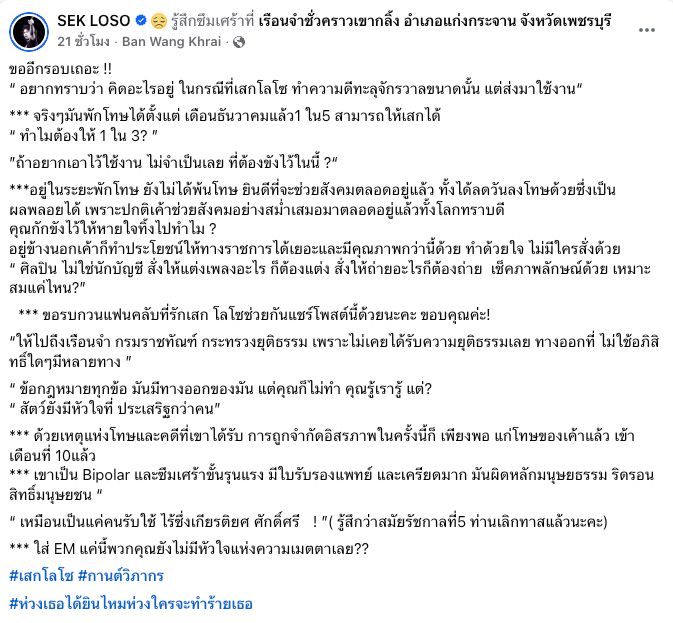 *** ด้วยเหตุแห่งโทษและคดีที่เขาได้รับ การถูกจำกัดอิสรภาพในครั้งนี้ก็ เพียงพอ แก่โทษของเค้าแล้ว เข้าเดือนที่ 10แล้ว *** เขาเป็น Bipolar และซึมเศร้าขั้นรุนแรง มีใบรับรองแพทย์ และเครียดมาก มันผิดหลักมนุษยธรรม ริดรอนสิทธิ์มนุษยชน“
