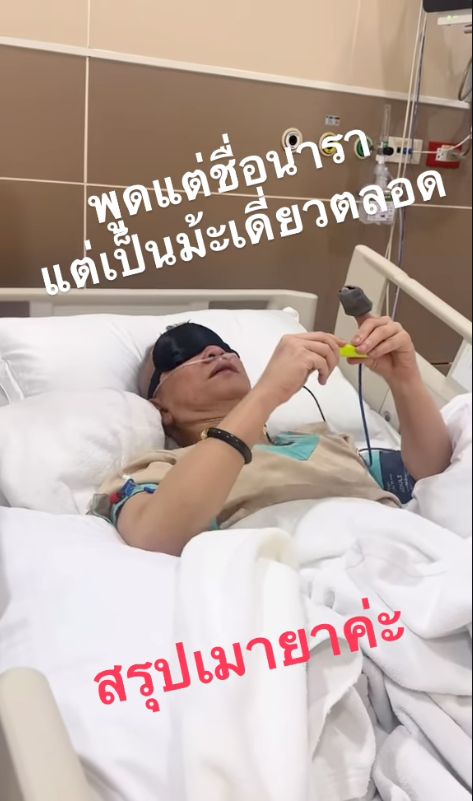 หน้าที่เราคือป่วย หน้าที่หมอคือรักษาเรา หนักครั้งแรก แต่พูดตรงๆ นะ หมอเนี่ยเขาประชุมกัน 6 วัน คือเขาประชุมกันทั้งวันทั้งคืนเลยเพื่อที่จะรักษาเรา หาสาเหตุแล้วก็รักษา แต่เรา 6 วันที่เราอยู่โรงพยาบาล เราก็มันไม่มีอะไร จริงๆ ไม่ตกใจว่ามีข่าวว่าเราเสียชีวิต เพราะเราเตรียมเสียชีวิตอยู่ตลอดอยู่แล้ว ไม่เคยกลัวเรื่องตายเลย จริงๆ 64 แล้วเราดูแลตัวเองยังไง คือเราเป็นคนที่ไปตรวจร่างกายทุก 3 เดือนอยู่แล้วใช่ไหมคะ แล้วก็เนื่องจากเราทำงานหนัก เราก็ต้องดูแลตัวเอง กินอาหารให้มีประโยชน์ แล้วก็ต้องไปตรวจร่างกายตลอดเวลาทุก 3 เดือนค่ะ
