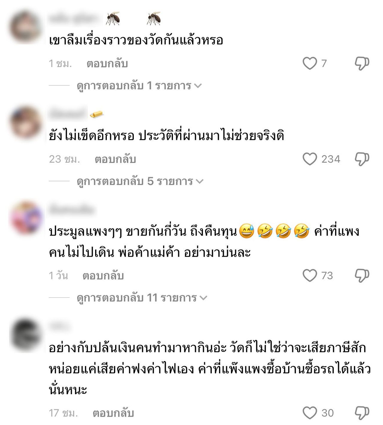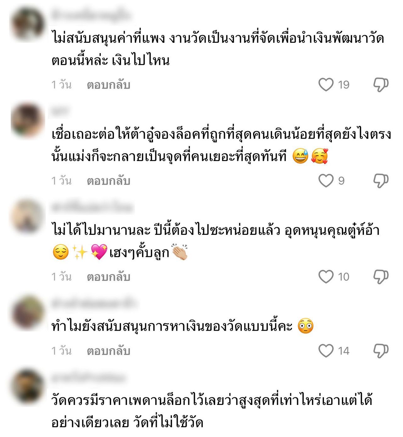ในขณะที่ชาวเน็ตบางกลุ่มได้เห็นคลิปก็เข้ามาคอมเมนต์กันเยอะมากๆ ไม่ว่าจะเป็น “ไม่สนับสนุนค่าที่แพง งานวัดเป็นงานที่จัดเพื่อนำเงินพัฒนาวัดตอนนี้ล่ะ เงินไปไหน?” , “ทำไมยังสนับสนุนการหาเงินของวัดแบบนี้?” , “วัดควรมีราคาเพดานล็อกไว้เลยว่าสูงสุดที่เท่าไหร่ เอาแต่ได้อย่างเดียวเลย” , “เขาลืมเรื่องราวของวัดกันแล้วเหรอ?” , “ยังไม่เข็ดอีกเหรอ ประวัติที่ผ่านมาไม่ช่วยจริงดิ?” , “มันเกินไป วัดไม่เสียภาษีนะคะ เงินได้แล้วไปไหนต่อ?”