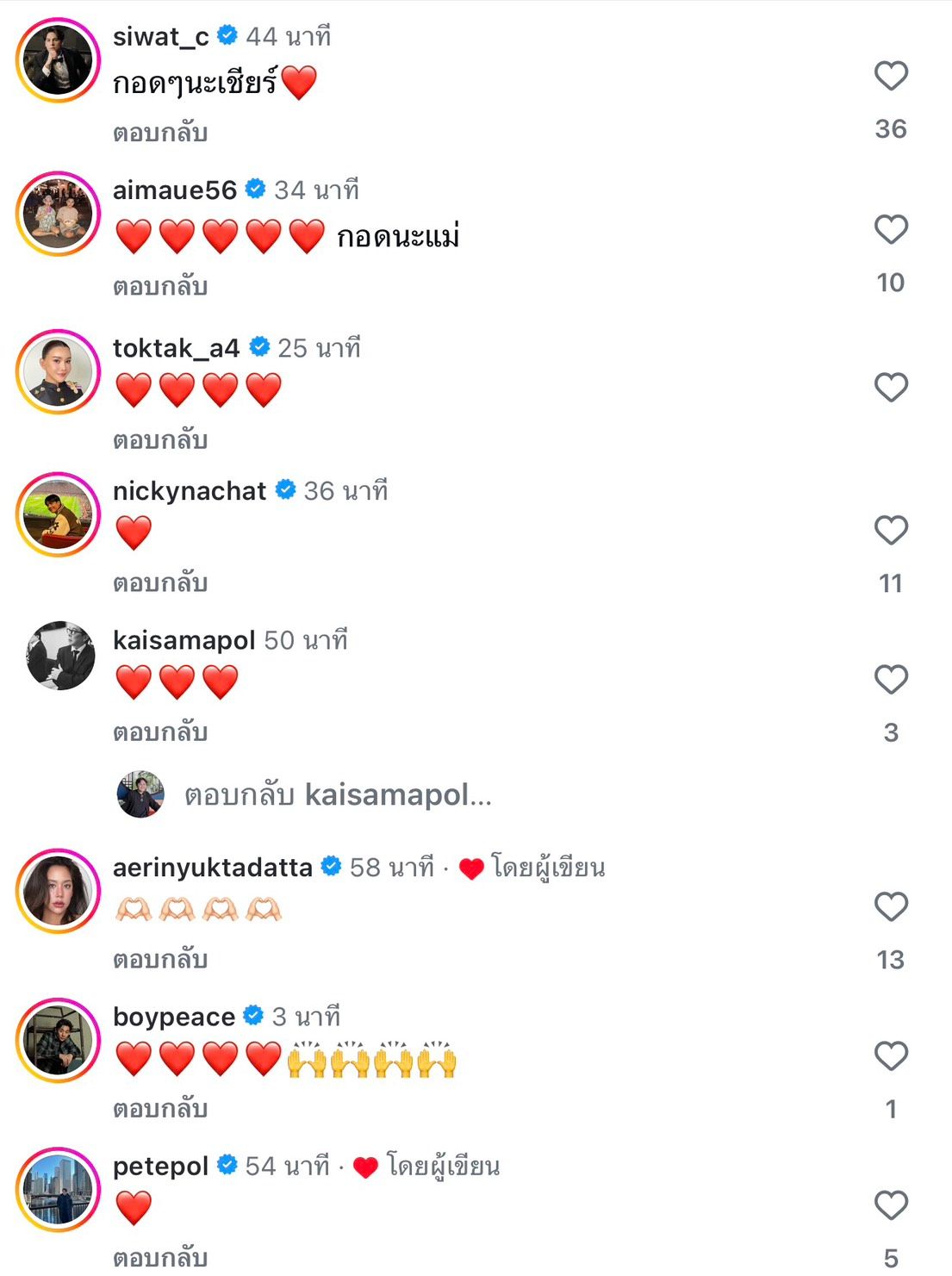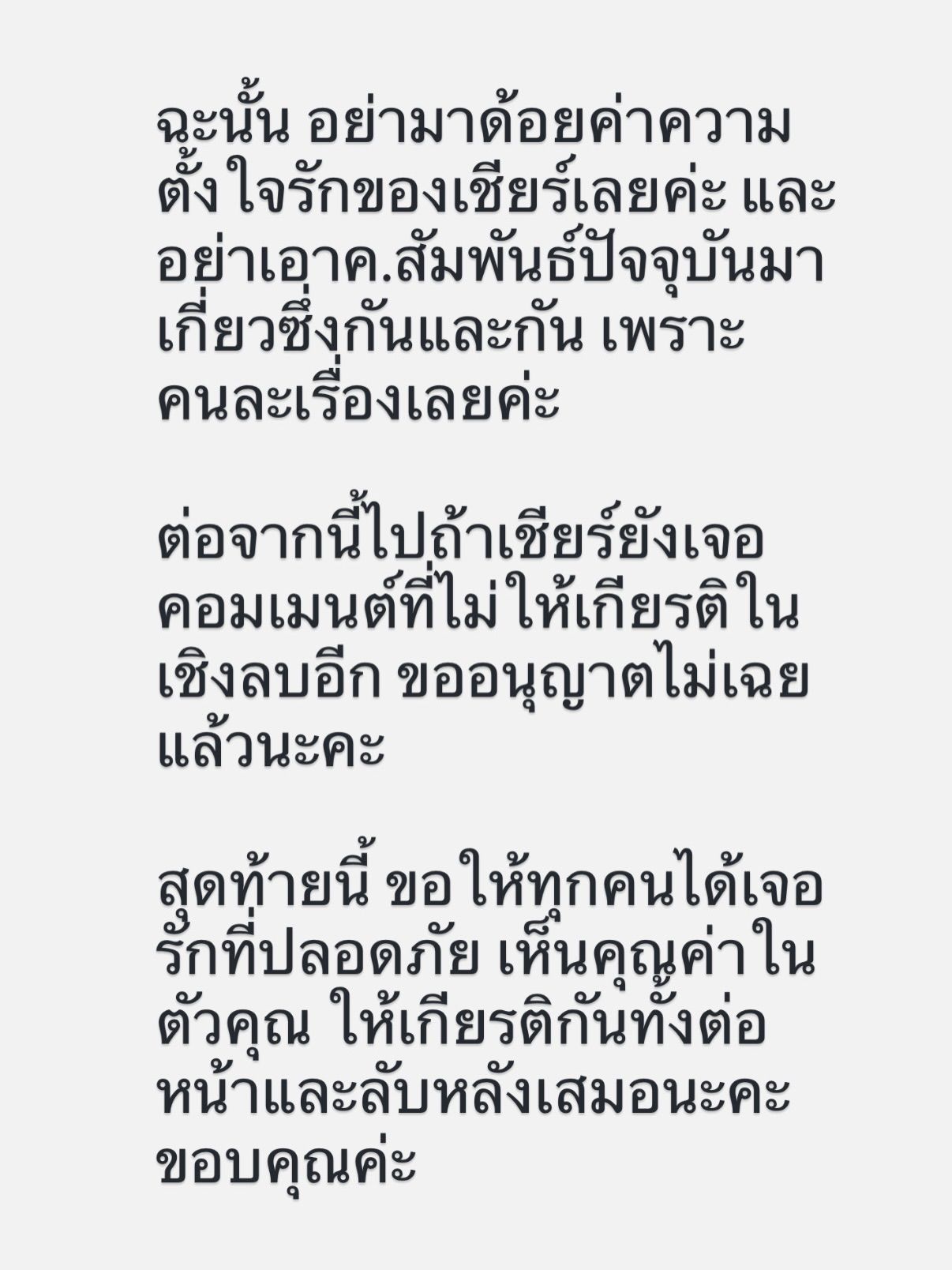 ซึ่งจากการคอมเมนต์ต่างๆ สร้างผลกระทบกับจิตใจของสาวเชียร์เป็นอย่างมาก ฉะนั้นไม่อยากจะให้มาด้อยค่าความรักและของเธอ และไม่อยากจะให้เอาความสัมพันธ์ปัจจุบันเข้ามาเกี่ยว เพราะมันคนละเรื่องกัน หลังจากนี้ถ้าเห็นคอมเมนต์เชิงลบที่ไม่ให้เกียรติกันจะไม่อยู่เฉยแล้ว ซึ่งหลังจากที่โพสต์ออกไปก็มีเพื่อนพี่น้องในวงการบันเทิงเข้ามาส่งกำลังใจให้เป็นจำนวนมาก