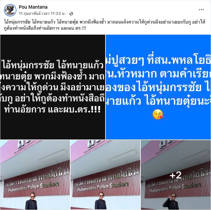 เมื่อถามว่า ปู มัณฑนา ได้โพสต์ข้อความไว้เมื่อวันที่ 11 ก.พ. 2569 ไว้ว่า "ไอ้หนุ่มกรรชัย ไอ้ทนายแก้ว ไอ้ทนายตุ๋ย พวกมึงฟ้องซ้ำ มาถอนแจ้งความให้กูด่วน มึงอย่ามาเยอะกับกู อย่าให้กูต้องทำหนังสือถึงท่านอัยการ และผบ.ตร!!"