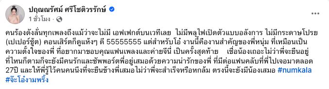 เชื่อน้องเถอะไม่ว่าพี่จะยืนอยู่ที่ไหนก็ตามก็จะยังมีคนรักและซัพพอร์ตพี่อยู่เสมอด้วยความน่ารักของพี่ ที่มีต่อแฟนคลับที่พี่ไปเจอมาตลอด 27 ปี และให้พี่รู้ไว้คนคนนึงที่จะยืนข้างพี่เสมอไม่ว่าพี่จะสำเร็จหรือหกล้ม ตรงนี้จะยังมีน้องเสมอ"