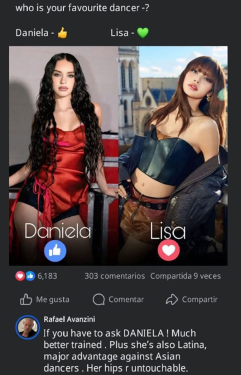 - กลายเป็นดราม่าสุดเดือดกลางโซเชียล เมื่อได้มีเฟซบุ๊กโพสต์ตั้งคำถามขึ้นมาว่า "who is your favourite dancer?" (ใครคือนักเต้นที่คุณชื่นชอบ) ซึ่งเพจดังกล่าวได้นำภาพของ "ดาเนียลา อวาซินี" (Daniela Avanzini) วัย 22 ปี สมาชิกวงเกิร์ลกรุ๊ป แคตอาย (KATSEYE) และ "ลิซ่า ลลิษา มโนบาล" หรือ "ลิซ่า BLACKPINK" วัย 28 ปี โดยให้โหวตว่า ถ้าชอบ "ดาเนียลา อวาซินี" ให้กดไลค์ และถ้าใครชอบ "ลิซ่า" ให้กดหัวใจ