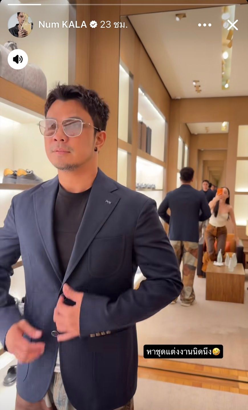 โดยเจ้าตัวได้เขียนสั้นๆ ในสตอรี่ว่า "หาชุดแต่งงานนิดนึง" ตบท้ายด้วยอิโมจิรูปหน้ายิ้มกรุ่มกริ่ม ซึ่งในคลิป หนุ่ม กะลา กำลังลองชุดสูท