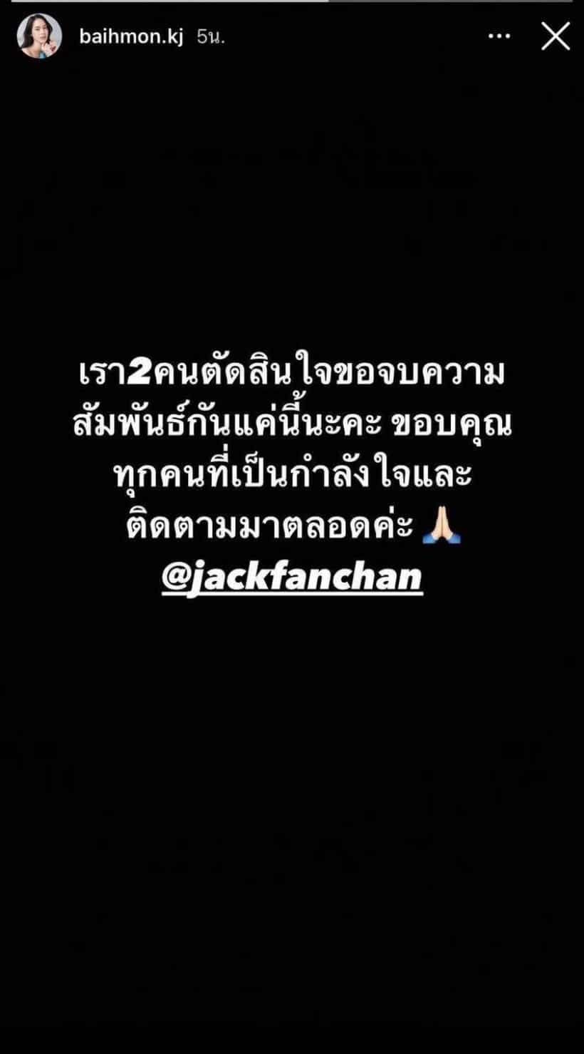 - จากนั้นผ่านไปได้เพียง 13 วัน ใบหม่อน ก็ได้โพสต์สตอรี่จบความสัมพันธ์กับ แจ็ค แฟนฉัน แต่จากนั้นโพสต์ดังกล่าวก็ถูกลบออกไปอย่างรวดเร็ว แต่สุดท้ายแล้ว ใบหม่อน ก็ได้ออกโพสต์ว่า เธอกับแจ็คได้คืนดีกันเป็นที่เรียบร้อยแล้ว หลังจากที่มีเรื่องผิดใจกันเล็กน้อย