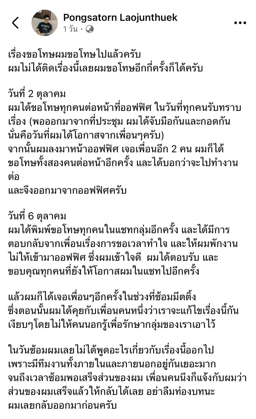 วันที่ 2 ตุลาคม ผมได้ขอโทษทุกคนต่อหน้าที่ออฟฟิศ ในวันที่ทุกคนรับทราบเรื่อง (พอออกมาจากที่ประชุม ผมได้จับมือกันและกอดกัน นั่นคือวันที่ผมได้โอกาสจากเพื่อนๆ ครับ) จากนั้นผมลงมาหน้าออฟฟิศ เจอเพื่อนอีก 2 คน ผมก็ได้ขอโทษทั้งสองคนต่อหน้าอีกครั้ง และได้บอกว่าจะไปทำงานต่อและจึงออกมาจากออฟฟิศครับ