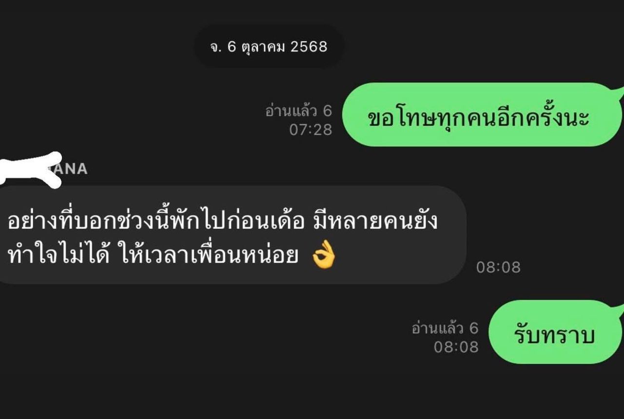 วันที่ 6 ตุลาคมผมได้พิมพ์ขอโทษทุกคนในแชตกลุ่มอีกครั้ง และได้มีการตอบกลับจากเพื่อนเรื่องการขอเวลาทำใจ และให้ผมพักงานไม่ให้เข้ามาออฟฟิศ ซึ่งผมเข้าใจดี ผมได้ตอบรับ และขอบคุณทุกคนที่ยังให้โอกาสผมในแชตไปอีกครั้ง