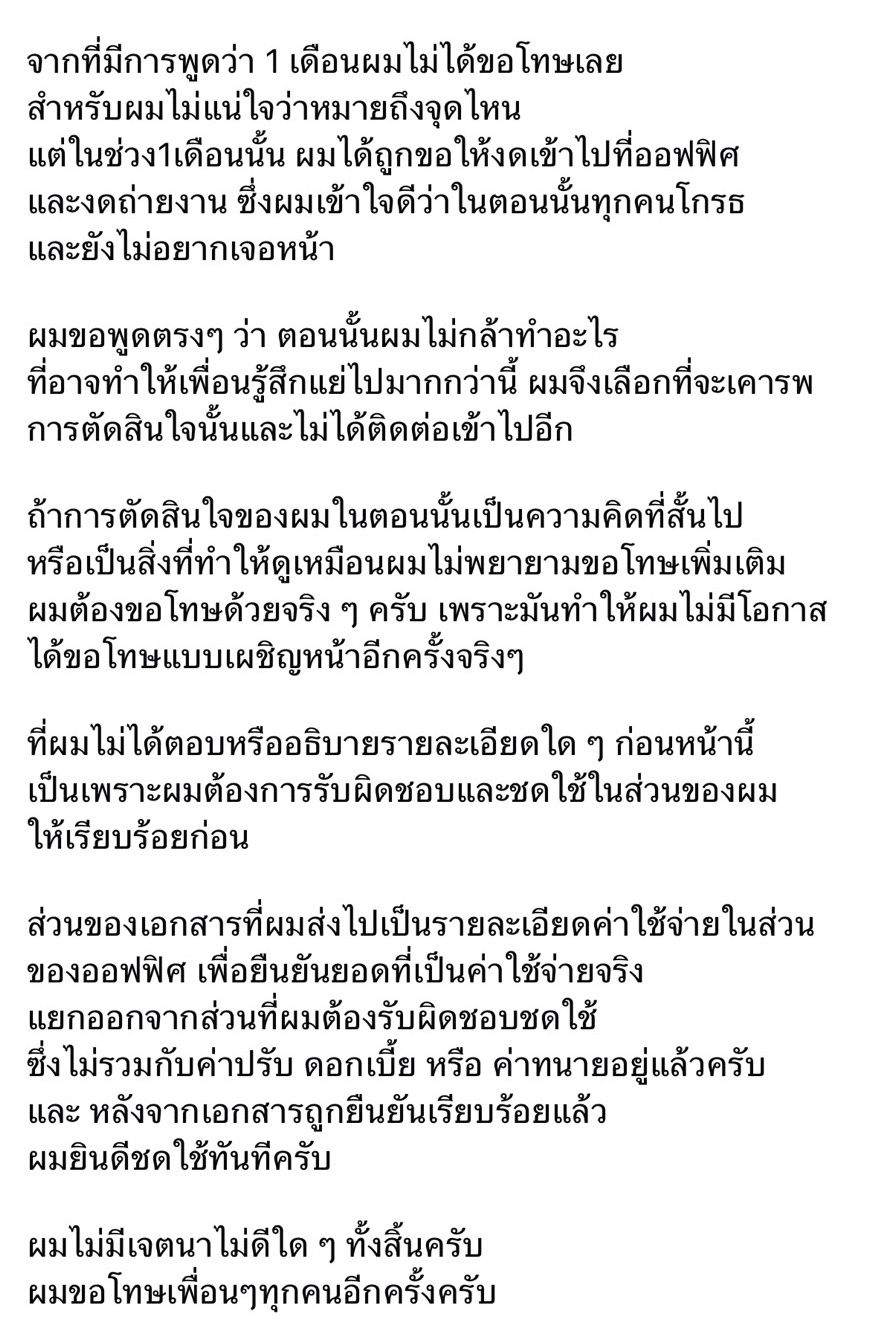 ส่วนของเอกสารที่ผมส่งไปเป็นรายละเอียดค่าใช้จ่ายในส่วนของออฟฟิศ เพื่อยืนยันยอดที่เป็นค่าใช้จ่ายจริง แยกออกจากส่วนที่ผมต้องรับผิดชอบชดใช้ ซึ่งไม่รวมกับค่าปรับ ดอกเบี้ยหรือค่าทนายอยู่แล้วครับ และหลังจากเอกสารถูกยืนยันเรียบร้อยแล้ว ผมยินดีชดใช้ทันทีครับ ผมไม่มีเจตนาไม่ดีใดๆ ทั้งสิ้นครับ ผมขอโทษเพื่อนๆ ทุกคนอีกครั้งครับ”