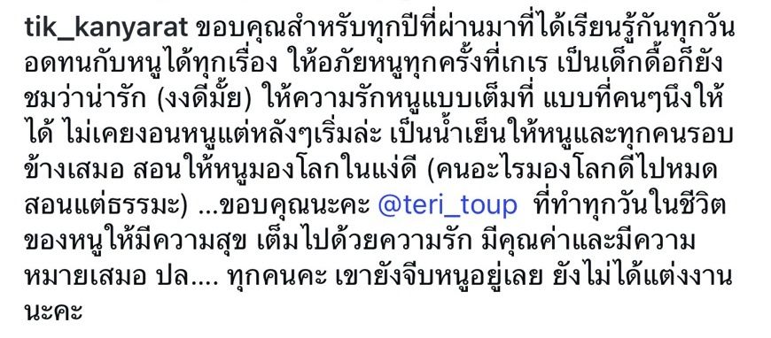 ก่อนที่ล่าสุด ติ๊ก จะแก้ไขข้อความ และเขียนเพิ่มว่า “ปล... ทุกคนคะ เขายังจีบหนูอยู่เลย ยังไม่ได้แต่งงานนะคะ”