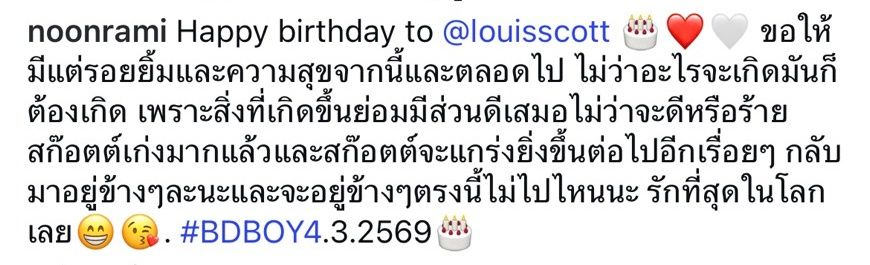 “Happy birthday to @louisscott ขอให้มีแต่รอยยิ้มและความสุขจากนี้และตลอดไป ไม่ว่าอะไรจะเกิดมันก็ต้องเกิด เพราะสิ่งที่เกิดขึ้นย่อมมีส่วนดีเสมอไม่ว่าจะดีหรือร้าย สก๊อตต์เก่งมากแล้วและสก๊อตต์จะแกร่งยิ่งขึ้นต่อไปอีกเรื่อยๆ กลับมาอยู่ข้างๆละนะและจะอยู่ข้างๆตรงนี้ไม่ไปไหนนะ รักที่สุดในโลกเลย #BDBOY4.3.2569”