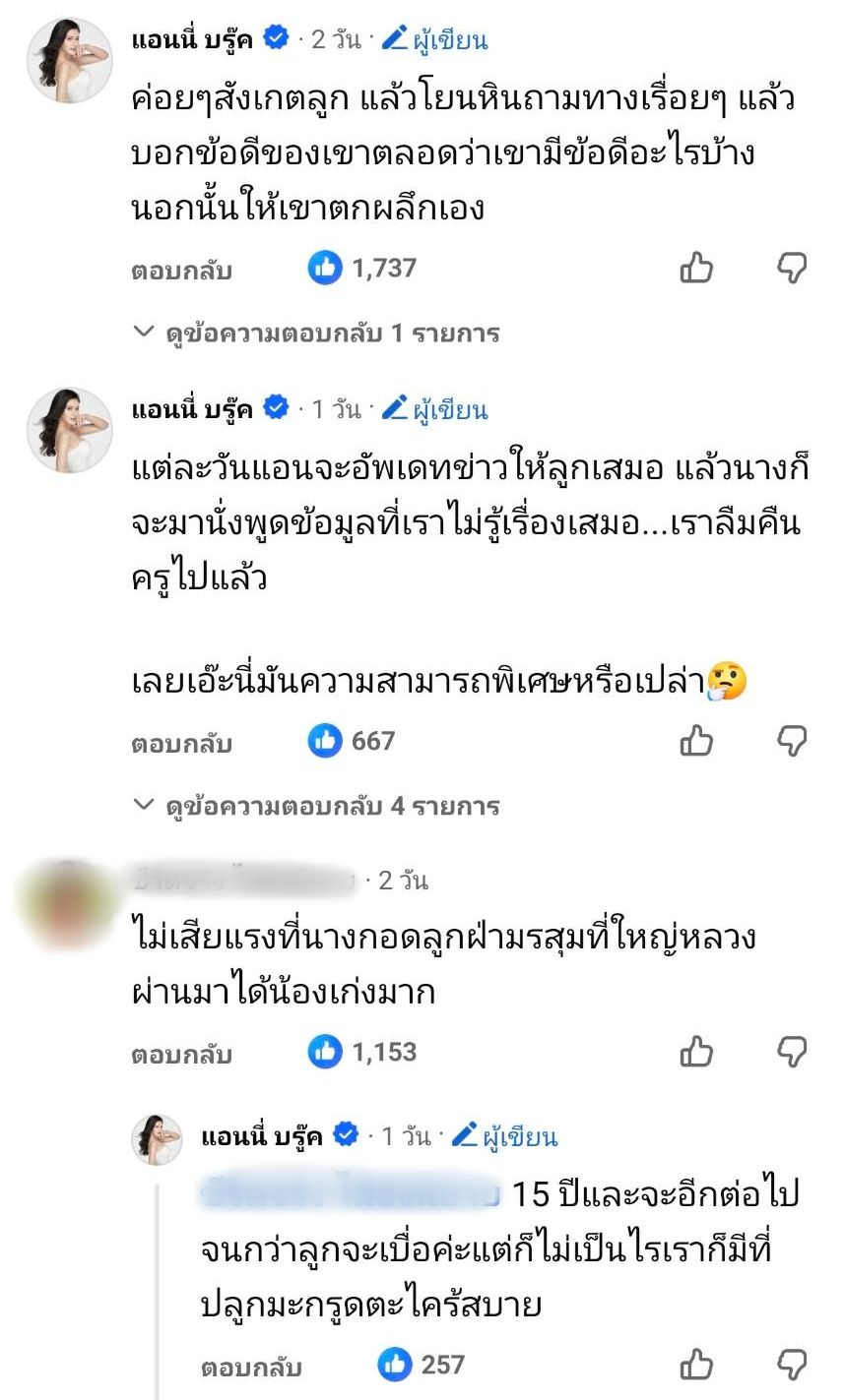 นอกจากนี้ แอนนี่ บรู๊ค ยังคอมเมนต์เพิ่มเติมใต้โพสต์ถึงการเลี้ยงลูกไว้ว่า “ค่อยๆ สังเกตลูก แล้วโยนหินถามทางเรื่อยๆ แล้วบอกข้อดีของเขาตลอดว่าเขามีข้อดีอะไรบ้าง นอกนั้นให้เขาตกผลึกเอง” และ “แต่ละวันแอนจะอัปเดตข่าวให้ลูกเสมอ แล้วนางก็จะมานั่งพูดข้อมูลที่เราไม่รู้เรื่องเสมอ...เราลืมคืนครูไปแล้ว เลยเอ๊ะนี่มันความสามารถพิเศษหรือเปล่า”