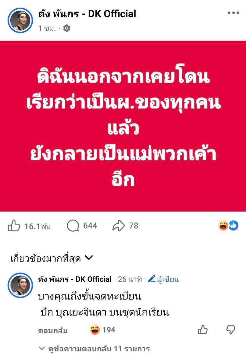 โดยในเฟซบุ๊กแฟนเพจ ดัง พันกร - DK Official ได้โพสต์ข้อความไว้ว่า “ดิฉันนอกจากเคยโดนเรียกว่าเป็น ผ. ของทุกคนแล้ว ยังกลายเป็นแม่พวกเค้าอีก” พร้อมทั้งคอมเมนต์เพิ่มเติมใต้โพสต์ว่า “บางคุณถึงขั้นจดทะเบียน ปัก บุณยะจินดา บนชุดนักเรียน”