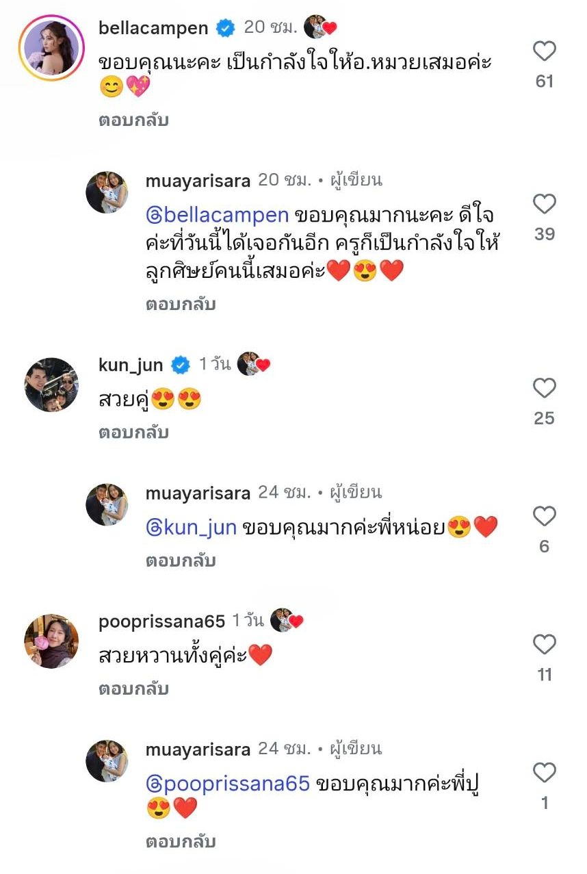 ซึ่ง เบลล่า ก็เข้ามาคอมเมนต์ตอบ หมวย อริสรา ว่า “ขอบคุณนะคะ เป็นกำลังใจให้ อ.หมวย เสมอค่ะ” ก่อนที่หมวยจะตอบกลับว่า “ขอบคุณมากนะคะ ดีใจค่ะที่วันนี้ได้เจอกันอีก ครูก็เป็นกำลังใจให้ลูกศิษย์คนนี้เสมอค่ะ"