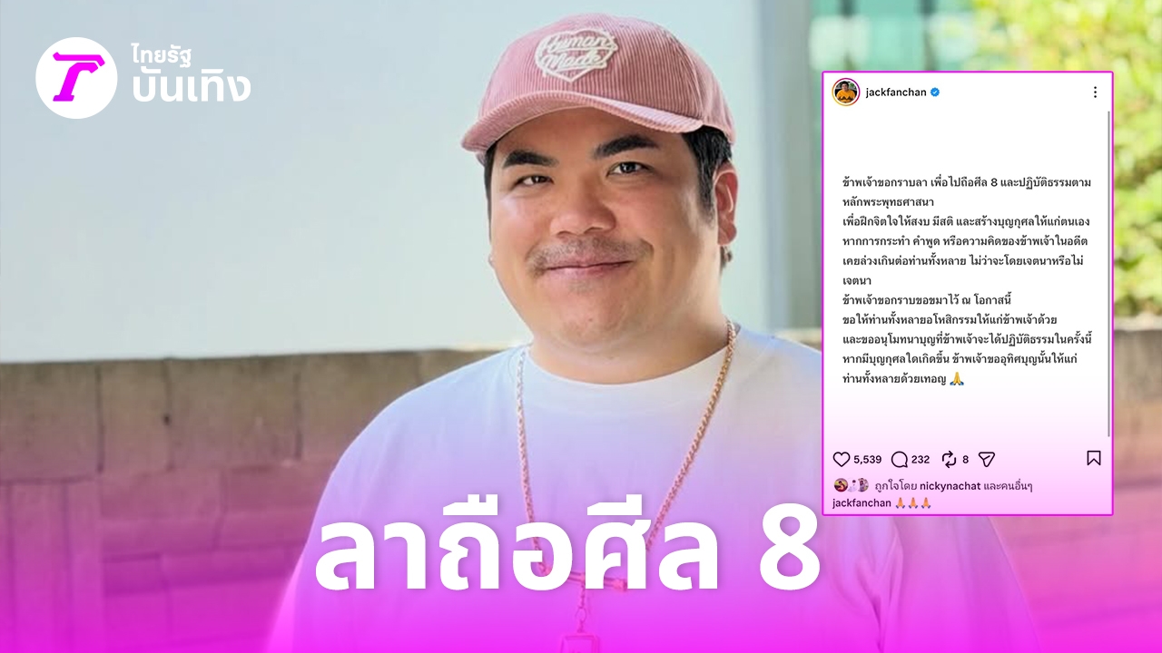 โดยในอินสตาแกรม @jackfanchan ได้โพสต์ภาพข้อความ ระบุว่า “ข้าพเจ้าขอกราบลา เพื่อไปถือศีล 8 และปฏิบัติธรรมตามหลักพระพุทธศาสนา เพื่อฝึกจิตใจให้สงบ มีสติ และสร้างบุญกุศลให้แก่ตนเอง หากการกระทํา คําพูด หรือความคิดของข้าพเจ้าในอดีต เคยล่วงเกินต่อท่านทั้งหลาย ไม่ว่าจะโดยเจตนาหรือไม่เจตนา