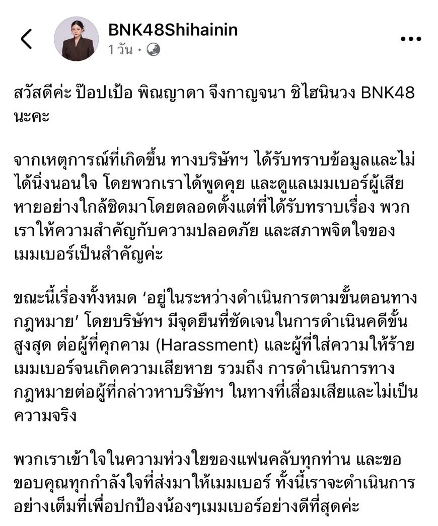 พวกเราเข้าใจในความห่วงใยของแฟนคลับทุกท่าน และขอขอบคุณทุกกำลังใจที่ส่งมาให้เมมเบอร์ ทั้งนี้เราจะดำเนินการอย่างเต็มที่เพื่อปกป้องน้องๆเมมเบอร์อย่างดีที่สุดค่ะ”