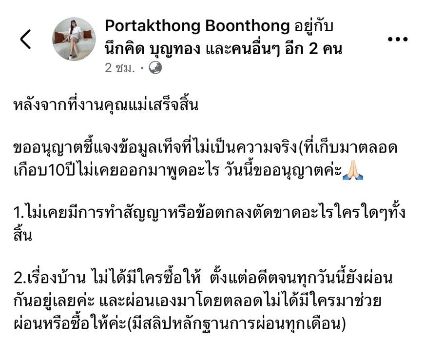 "หลังจากที่งานคุณแม่เสร็จสิ้น ขออนุญาตชี้แจงข้อมูลเท็จที่ไม่เป็นความจริง(ที่เก็บมาตลอดเกือบ10 ปีไม่เคยออกมาพูดอะไร) วันนี้ขออนุญาตค่ะ