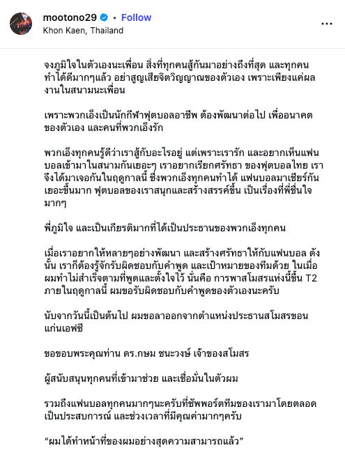 พี่ภูมิใจ และเป็นเกียรติมากที่ได้เป็นประธานของพวกเอ็งทุกคน เมื่อเราอยากให้หลายๆอย่างพัฒนา และสร้างศรัทธาให้กับแฟนบอล ดังนั้น เราก็ต้องรู้จักรับผิดชอบกับคำพูด และเป้าหมายของทีมด้วย ในเมื่อผมทำไม่สำเร็จตามที่พูดและตั้งใจไว้ นั่นคือ การพาสโมสรแห่งนี้ขึ้น T2 ภายในฤดูกาลนี้ ผมขอรับผิดชอบกับคำพูดของตัวเองนะครับ นับจากวันนี้เป็นต้นไป ผมขอลาออกจากตำแหน่งประธานสโมสรขอนแก่นเอฟซี ขอขอบพระคุณท่าน ดร.กษม ชนะวงษ์ เจ้าของสโมสร ผู้สนับสนุนทุกคนที่เข้ามาช่วย และเชื่อมั่นในตัวผม รวมถึงแฟนบอลทุกคนมากๆนะครับที่ซัพพอร์ตทีมของเรามาโดยตลอด เป็นประสบการณ์ และช่วงเวลาที่มีคุณค่ามากๆครับ “ผมได้ทำหน้าที่ของผมอย่างสุดความสามารถแล้ว” โตโน่ ภาคิน คำวิลัยศักดิ์ ตัวสำรองหมายเลข 10” ซึ่งหลังจากที่ “หนุ่มโตโน่” โพสต์ออกไป แฟน ๆ ก็เข้ามาคอมเมนต์เป็นกำลังใจให้กันเยอะมาก ๆ
