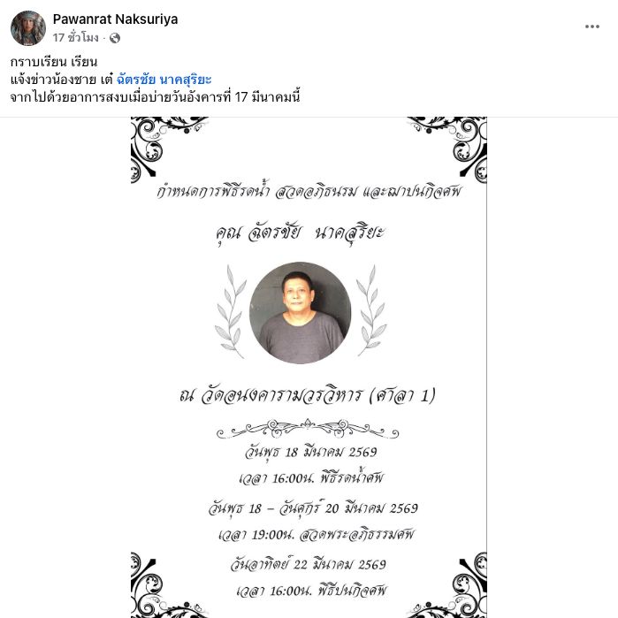 เป็นข่าวเศร้าของวงการบันเทิงอีกครั้งกับการจากไปของผู้กำกับภาพตากล้องคนดัง พี่เต๋-ฉัตรชัย นาคสุริยะ ผู้เคยฝากผลงานในละคร #สร้อยแสงจันทร์ ,#นิราศสองภพ , #พรายปรารถนาฯลฯ และผลงานการกำกับการแสดงละคร #อินทรีแดง (เวอร์ชั่นเจมส์เรืองศักดิ์) จากไปอย่างสงบเมื่อช่วงบ่ายที่ผ่านมา(17 มีนาคม 2569) หลังป่วยด้วยโรคอัลไซเมอร์ และรักษาตัวอยู่หลายปี