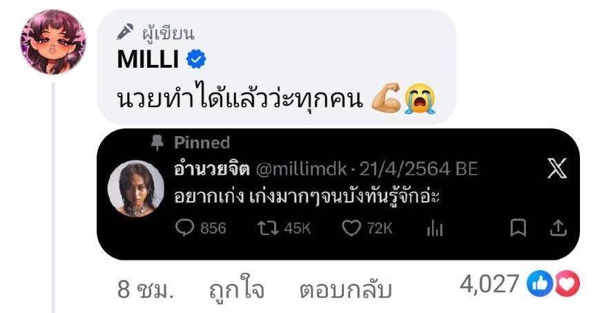 เรียกว่าชีวิตติ่งคอมพลีตเรียบร้อยแล้ว สำหรับแร็ปเปอร์สาวเก่ง MILLI หรือ มิลลิ ดนุภา คณาธีรกุล ที่ก่อนหน้านี้เคยโพสต์ไว้ว่า “อยากเก่ง เก่งมากๆ จนบังทันรู้จักอ่ะ” จนกลายเป็นกระแสฮือฮามาแล้ว