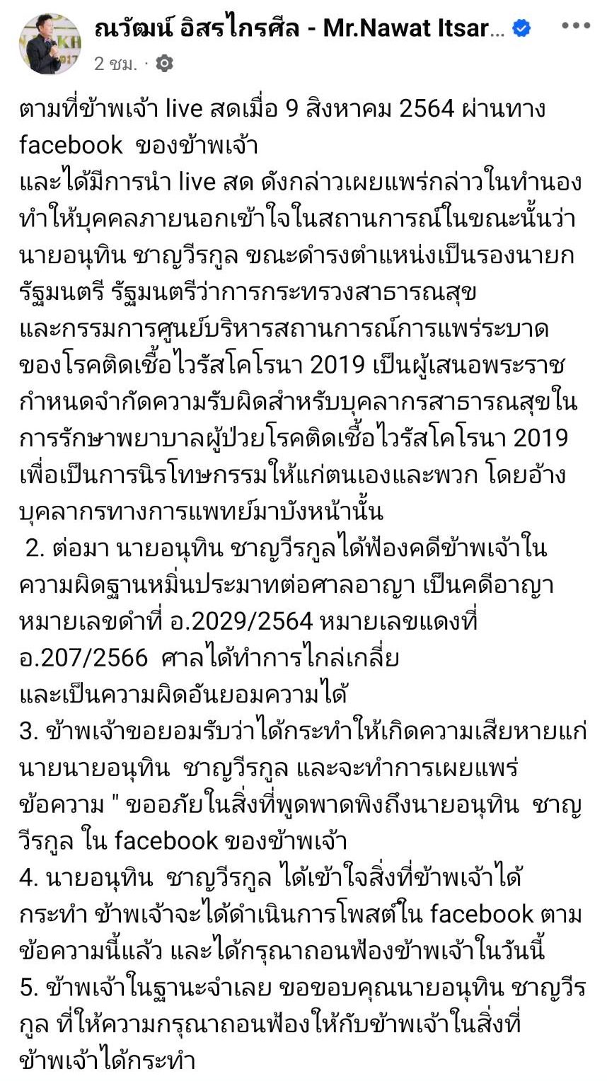 4. นายอนุทิน ชาญวีรกูล ได้เข้าใจสิ่งที่ข้าพเจ้าได้กระทำ ข้าพเจ้าจะได้ดำเนินการโพสต์ใน facebook ตามข้อความนี้แล้ว และได้กรุณาถอนฟ้องข้าพเจ้าในวันนี้