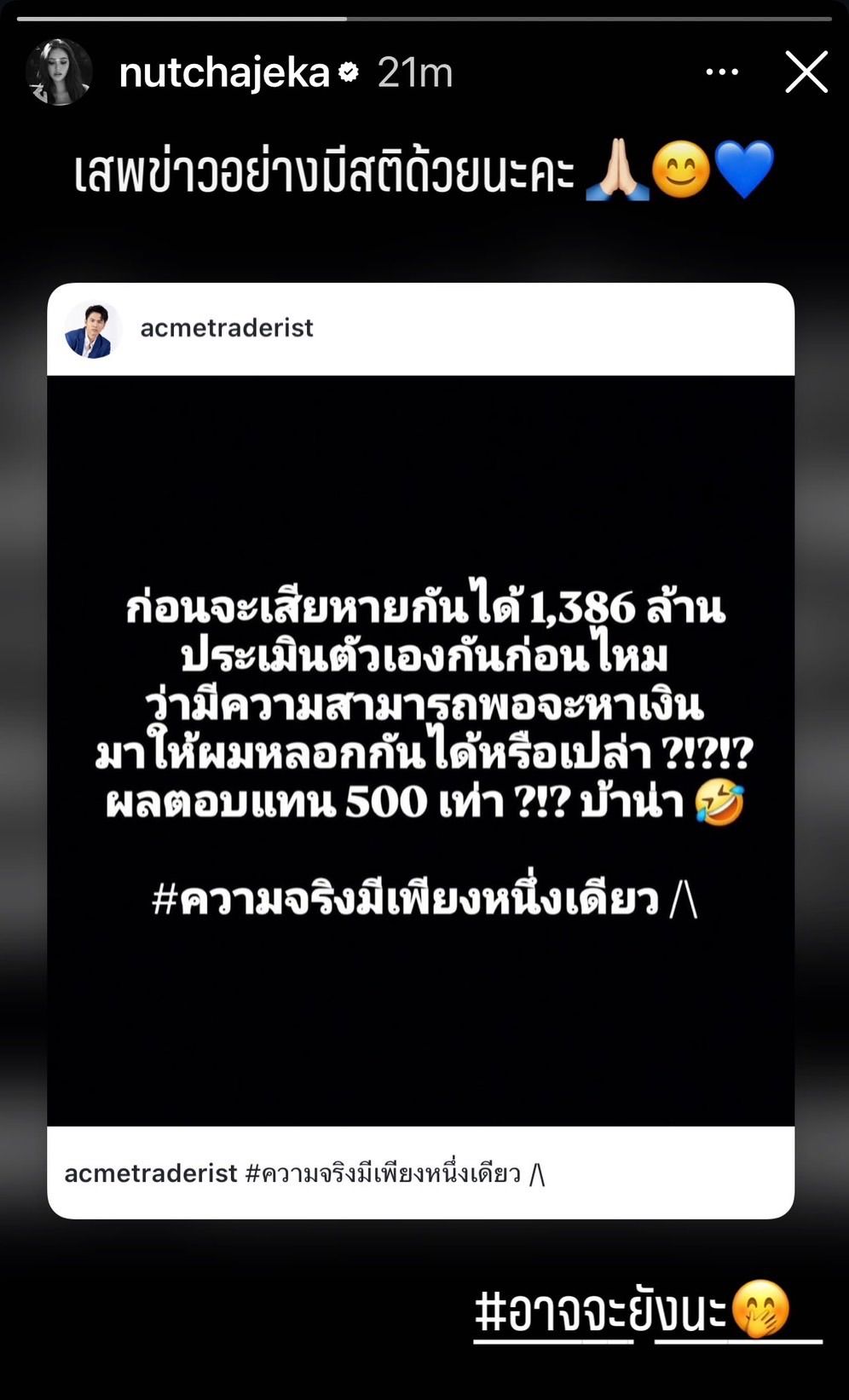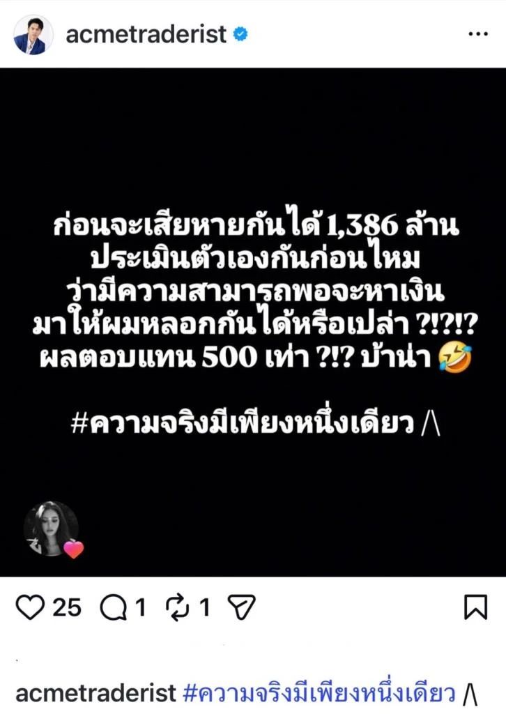 ล่าสุด แอ็คมี่ วรวัฒน์ โต้กลับทางโซเชียลถึงประเด็นดังกล่าว โดยโพสต์ข้อความว่า “ก่อนจะเสียหายกันได้ 1,386 ล้าน ประเมินตัวเองกันก่อนไหม ว่ามีความสามารถพอจะหาเงินมาให้ผมหลอกกันได้หรือเปล่า ?!?!? ผลตอบแทน 500 เท่า ?!? บ้าน่า #ความจริงมีเพียงหนึ่งเดียว”