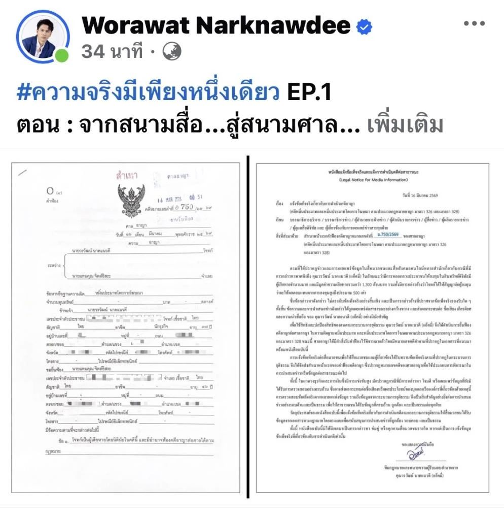 วันนี้ผมเลือกทำสิ่งที่สำคัญสิ่งหนึ่งก่อน นำเรื่องเข้าสู่ศาล ให้ศาลท่านเป็นผู้ชี้ขาดตัดสิน ผมได้มอบหมายให้ทนายความดำเนินการยื่นฟ้อง นายแทนคุณ จิต……………….. ในความผิดฐานหมิ่นประมาท และหมิ่นประมาทโดยการโฆษณา ตามประมวลกฎหมายอาญา มาตรา 326 และมาตรา 328 ขณะนี้ ศาลอาญาได้มีคำสั่งรับคำฟ้องไว้พิจารณาแล้ว