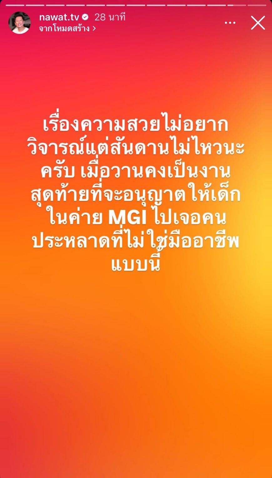 ทำเอาแฟนนางงามต่างพากันล้อมวงเข้ามามุง เมื่อ บอสณวัฒน์ อิสรไกรศีล เจ้าของเวทีมิสแกรนด์ฯ ถึงโพสต์ข้อความแบบฟาดๆ ผ่านไอจีสตอรี่แถมยังใช้สีส้มอีกด้วย เขียนว่า