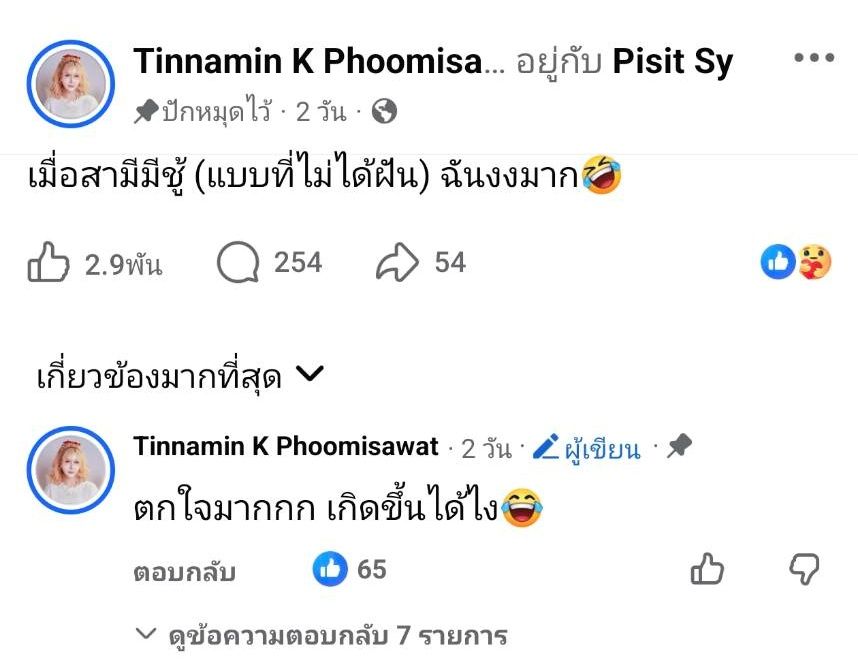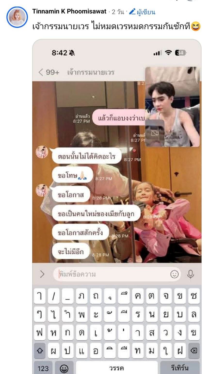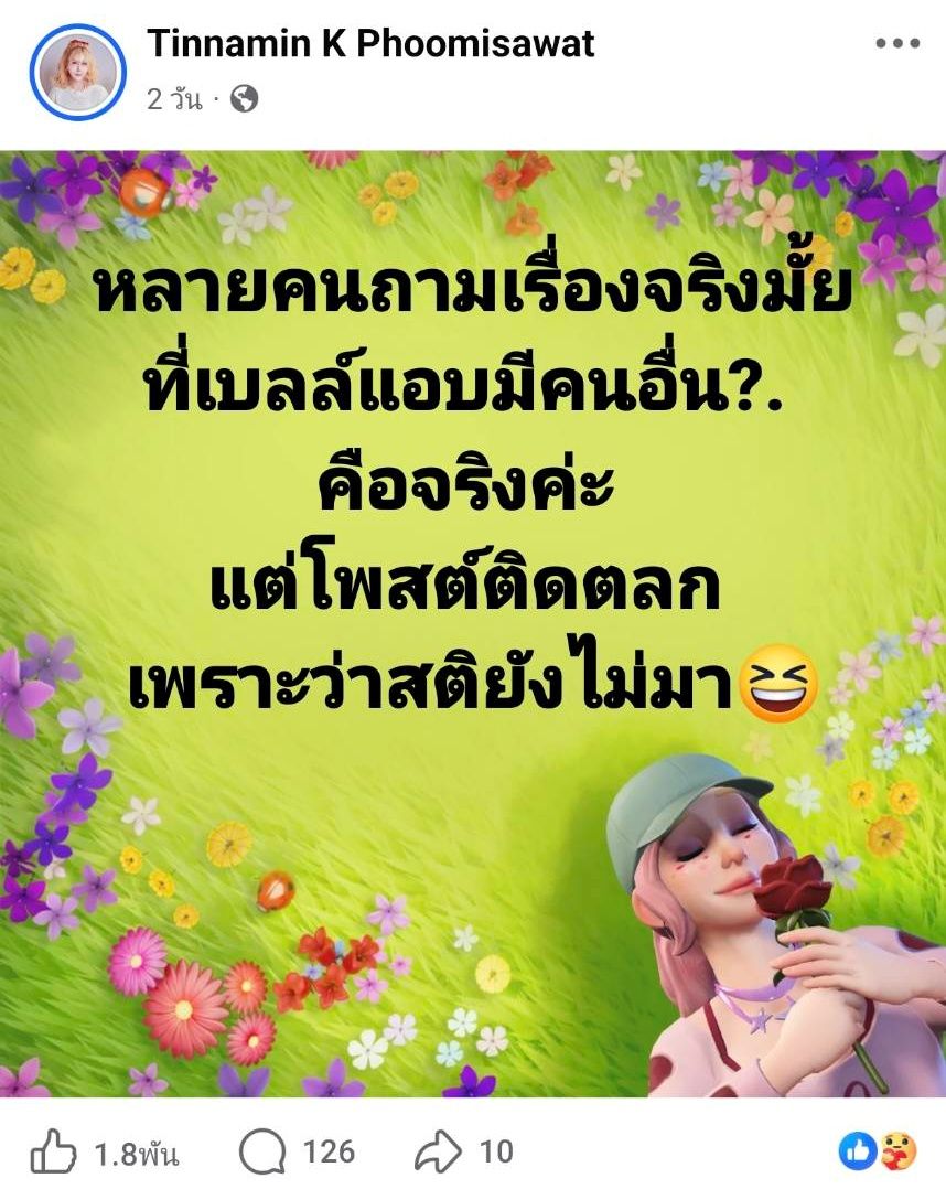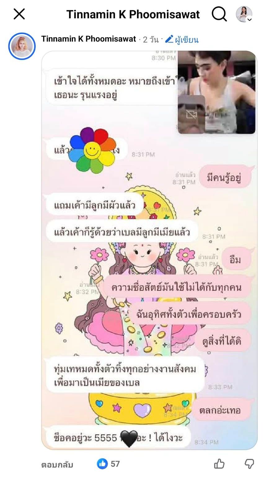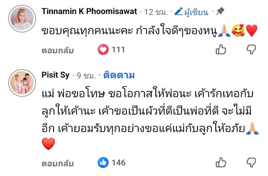 นอกจากนี้ เบลล์ อเนกลาภ คอมเมนต์ใต้โพสต์ของภรรยาด้วย โดยบอกว่า “แม่ พ่อขอโทษ ขอโอกาสให้พ่อนะ เค้ารักเทอกับลูกให้เค้านะ เค้าขอเป็นผัวที่ดีเป็นพ่อที่ดี จะไม่มีอีก เค้ายอมรับทุกอย่างขอแค่แม่กับลูกให้อภัย”
