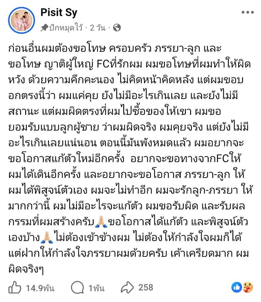 ตอนนี้มันพังหมดแล้ว ผมอยากจะขอโอกาสแก้ตัวใหม่อีกครั้ง อยากจะขอทางจาก FC ให้ผมได้เดินอีกครั้ง และอยากจะขอโอกาส ภรรยา-ลูก ให้ผมได้พิสูจน์ตัวเอง ผมจะไม่ทำอีก ผมจะรักลูก-ภรรยา ให้มากกว่านี้ ผมไม่มีอะไรจะแก้ตัว ผมขอรับผิด และรับผลกรรมที่ผมสร้างครับ ขอโอกาสได้แก้ตัว และพิสูจน์ตัวเองบ้าง ไม่ต้องเข้าข้างผม ไม่ต้องให้กำลังใจผมก็ได้ แต่ฝากให้กำลังใจภรรยาผมด้วยครับ เค้าเครียดมาก ผมผิดจริงๆ”