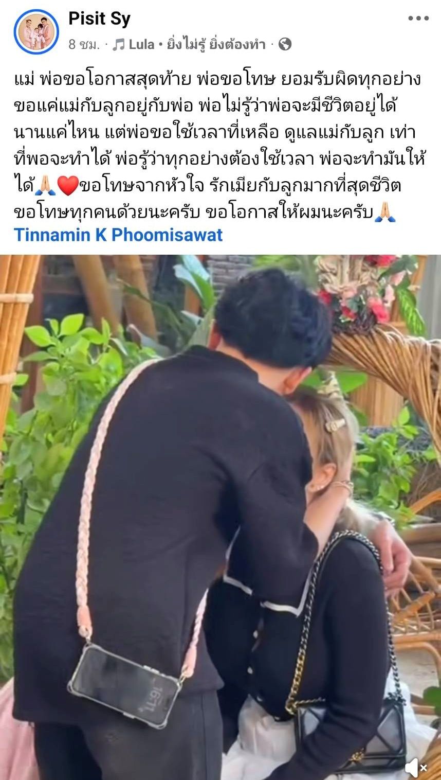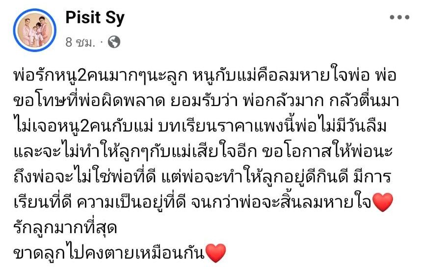 ก่อนจะโพสต์ภาพลูกๆ ทั้งสองคน และเขียนข้อความว่า “พ่อรักหนู 2 คนมากๆ นะลูก หนูกับแม่คือลมหายใจพ่อ พ่อขอโทษที่พ่อผิดพลาด ยอมรับว่า พ่อกลัวมาก กลัวตื่นมาไม่เจอหนู 2 คนกับแม่ บทเรียนราคาแพงนี้พ่อไม่มีวันลืมและจะไม่ทำให้ลูกๆ กับแม่เสียใจอีก ขอโอกาสให้พ่อนะ ถึงพ่อจะไม่ใช่พ่อที่ดี แต่พ่อจะทำให้ลูกอยู่ดีกินดี มีการเรียนที่ดี ความเป็นอยู่ที่ดี จนกว่าพ่อจะสิ้นลมหายใจ รักลูกมากที่สุด ขาดลูกไปคงตายเหมือนกัน ”