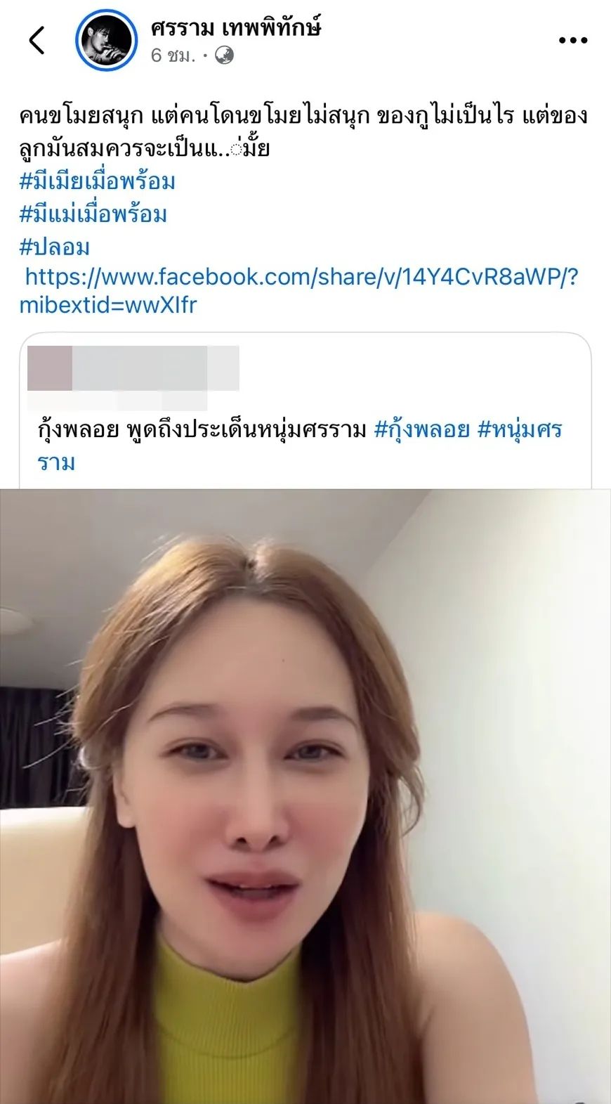 แต่เรื่องไม่จบง่ายๆ เมื่อมีชาวเน็ตแชร์คลิปที่กุ้งพลอยพูดในทำนองว่าตัวเองเป็นนางโจรขโมยเงินผัว ก่อนที่หนุ่มจะแชร์คลิปดังกล่าวพร้อมทั้งโพสต์ข้อความเดือด “คนขโมยสนุก แต่คนโดนขโมยไม่สนุก ของกูไม่เป็นไร แต่ของลูกมันสมควรจะเป็นแม่มั้ย #มีเมียเมื่อพร้อม #มีแม่เมื่อพร้อม #ปลอม”