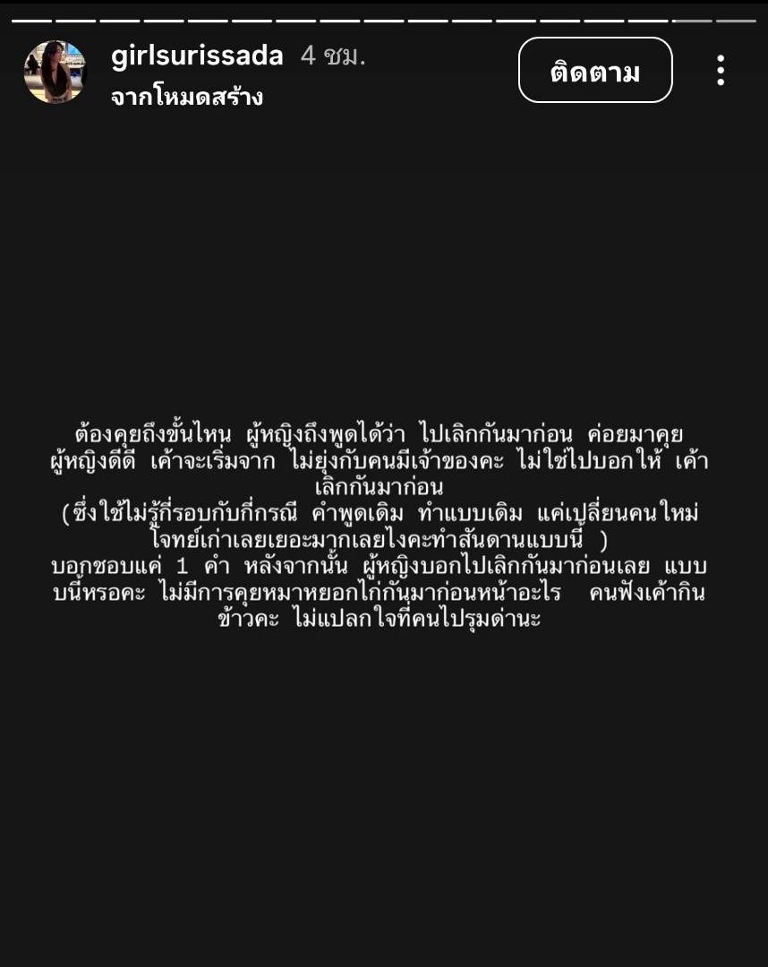 จากนั้นเกิลก็โพสต์ข้อความเดือดอีกครั้ง โดยบอกว่า “ต้องคุยถึงขั้นไหน ผู้หญิงถึงพูดได้ว่าไปเลิกกันมาก่อนค่อยมาคุย ผู้หญิงดีๆ เขาจะเริ่มจากไม่ยุ่งกับคนมีเจ้าของค่ะ ไม่ใช่ไปบอกให้เขาเลิกกันมาก่อน (ซึ่งใช้ไม่รู้กี่รอบกับกี่กรณี คำพูดเดิม ทำแบบเดิม แค่เปลี่ยนคนใหม่ โจทย์เก่าเลยเยอะมากเลยไงคะ ทำสันดาxแบบนี้)