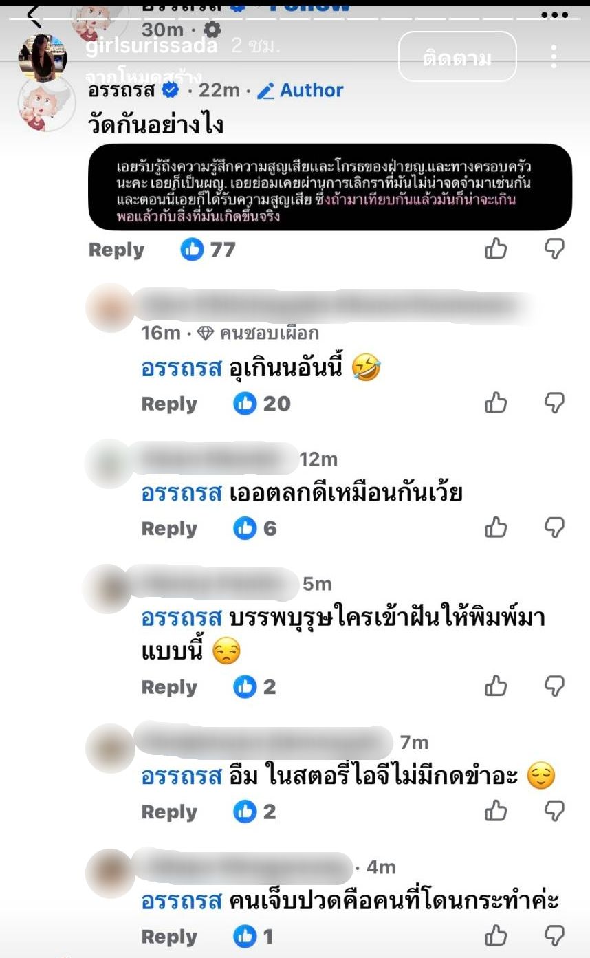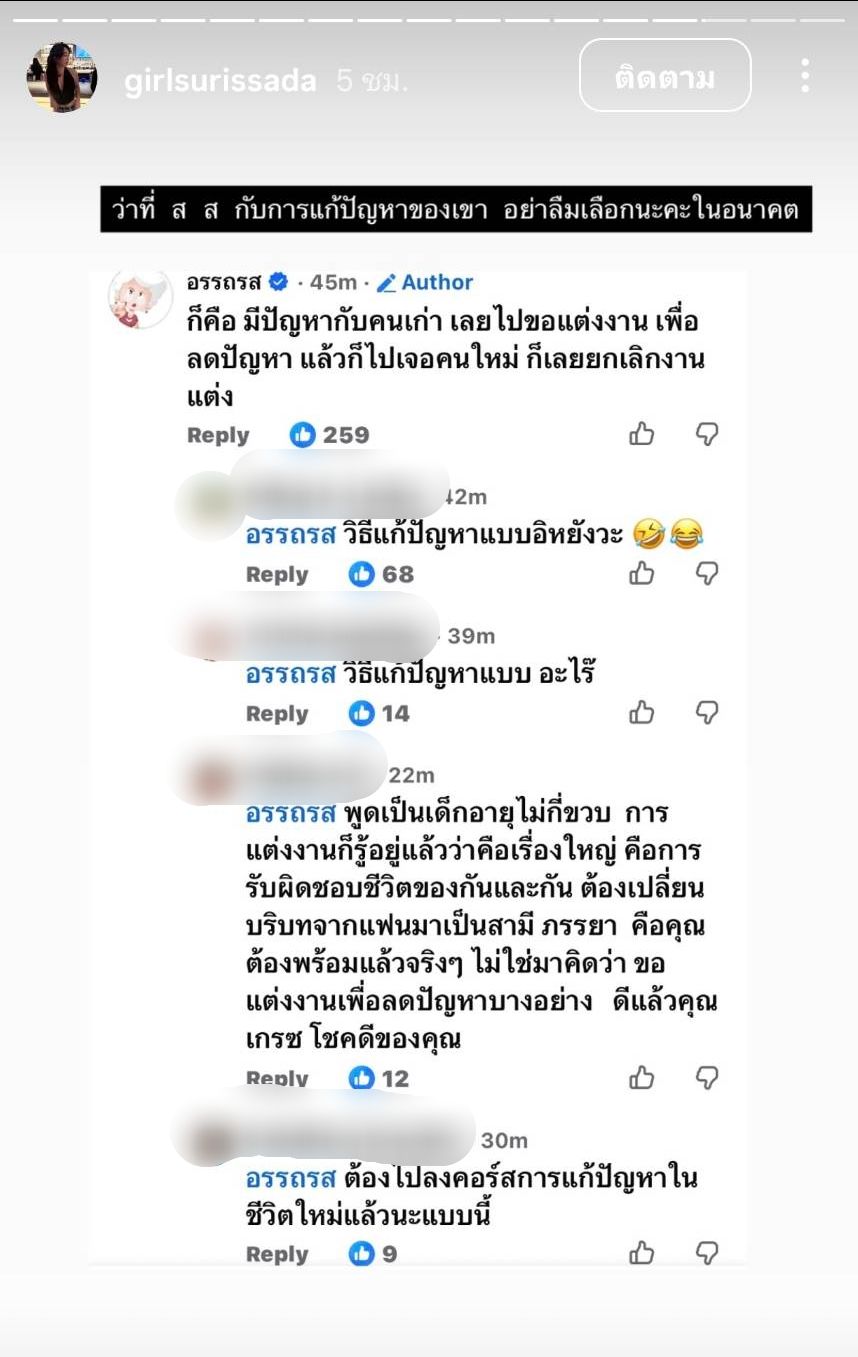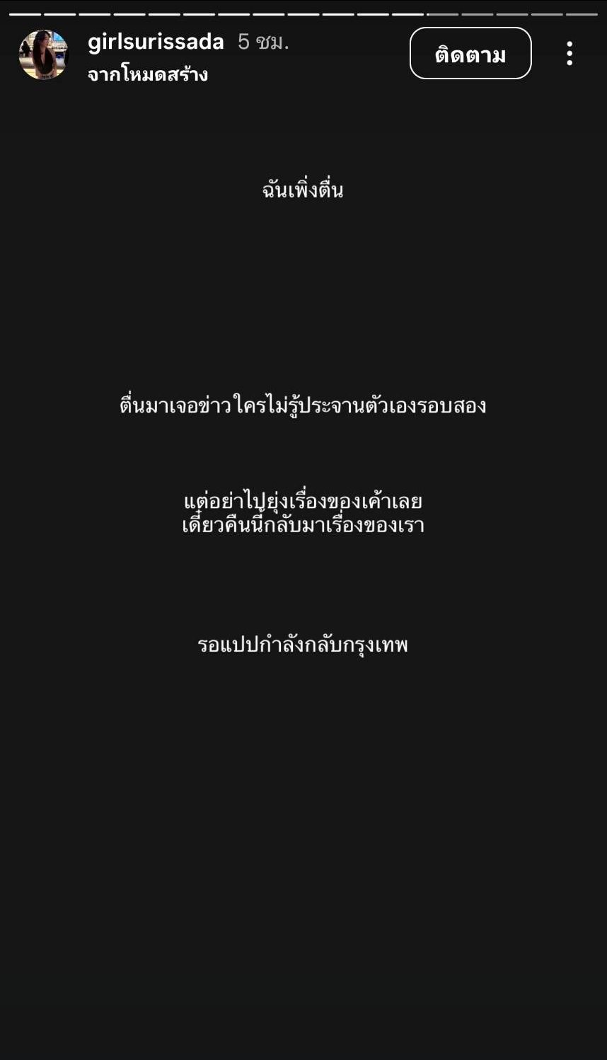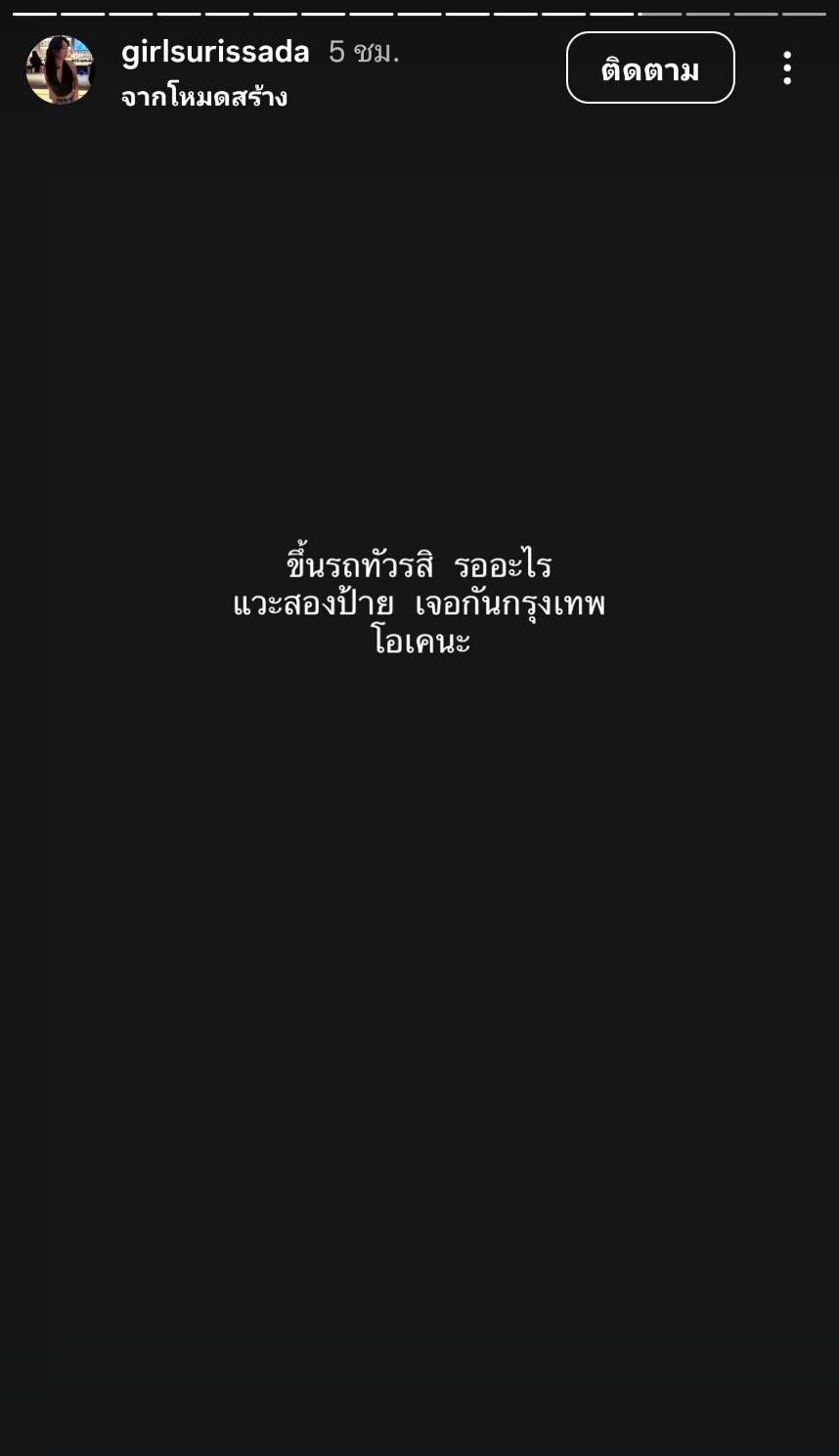 ล่าสุด เกิล สุริสดา ก็ออกโรงโพสต์ข้อความแซ่บผ่านทางไอจีสตอรี่เช่นกัน โดยบอกว่า “ฉันเพิ่งตื่น ตื่นมาเจอข่าวใครไม่รู้ประจานตัวเองรอบสอง แต่อย่าไปยุ่งเรื่องของเขาเลย เดี๋ยวคืนนี้กลับมาเรื่องของเรา รอแป๊บกำลังกลับกรุงเทพฯ” และ “ขึ้นรถทัวร์สิ รออะไร แวะสองป้าย เจอกันกรุงเทพฯ โอเคนะ” ก่อนจะแคปภาพข้อความคอมเมนต์จากเพจดัง และเขียนข้อความ “ว่าที่ สส. กับการแก้ปัญหาของเขา อย่าลืมเลือกนะคะในอนาคต”