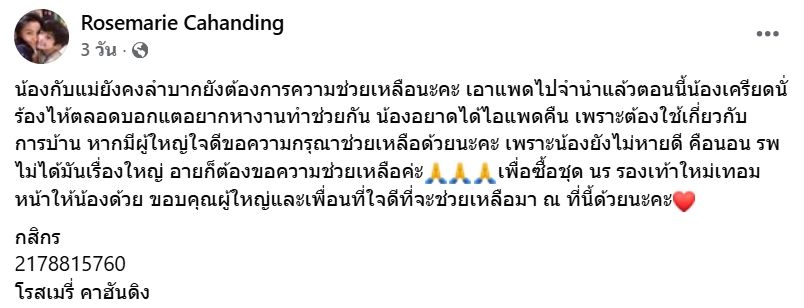 "น้องกับแม่ยังคงลำบาก ยังต้องการความช่วยเหลือนะคะ เอาแพดไปจำนำแล้ว ตอนนี้น้องเครียดนั่งร้องไห้ตลอด บอกแต่อยากหางานทำช่วยกัน น้องอยากได้ไอแพดคืน เพราะต้องใช้เกี่ยวกับการบ้าน หากมีผู้ใหญ่ใจดีขอความกรุณาช่วยเหลือด้วยนะคะ เพราะน้องยังไม่หายดี คือนอน รพ. ไม่ได้ มันเรื่องใหญ่ อายก็ต้องขอความช่วยเหลือค่ะ เพื่อซื้อชุด นร. รองเท้าใหม่เทอมหน้าให้น้องด้วย ขอบคุณผู้ใหญ่และเพื่อนที่ใจดีที่จะช่วยเหลือมา ณ ที่นี้ด้วยนะคะ”