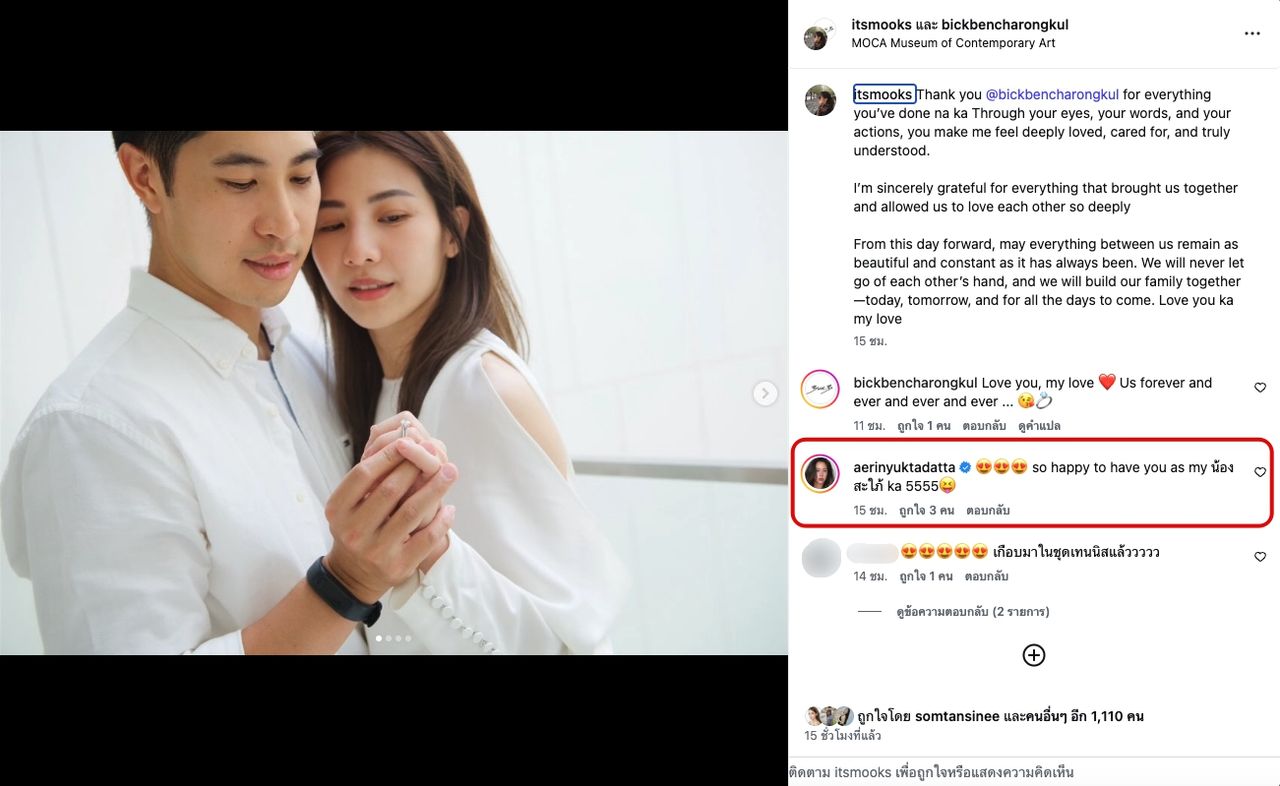 ซึ่งแปลความได้ว่า “ขอบคุณนะคะ @bickbencharongkul สำหรับทุกสิ่งทุกอย่างที่คุณทำให้ผ่านสายตา คำพูด และการกระทำของคุณ ทำให้ฉันรู้สึกได้ถึงความรัก ความห่วงใย และการถูกเข้าใจอย่างแท้จริง ฉันรู้สึกขอบคุณจากใจสำหรับทุกอย่างที่พาเราให้มาเจอกัน และทำให้เราได้รักกันอย่างลึกซึ้งขนาดนี้ ตั้งแต่วันนี้เป็นต้นไป ขอให้ทุกอย่างระหว่างเรายังคงสวยงามและมั่นคงแบบนี้ตลอดไป เราจะไม่มีวันปล่อยมือกัน และจะช่วยกันสร้างครอบครัวของเราไปด้วยกัน—วันนี้ พรุ่งนี้ และทุก ๆ วันต่อจากนี้ รักนะคะ ที่รักของฉัน”